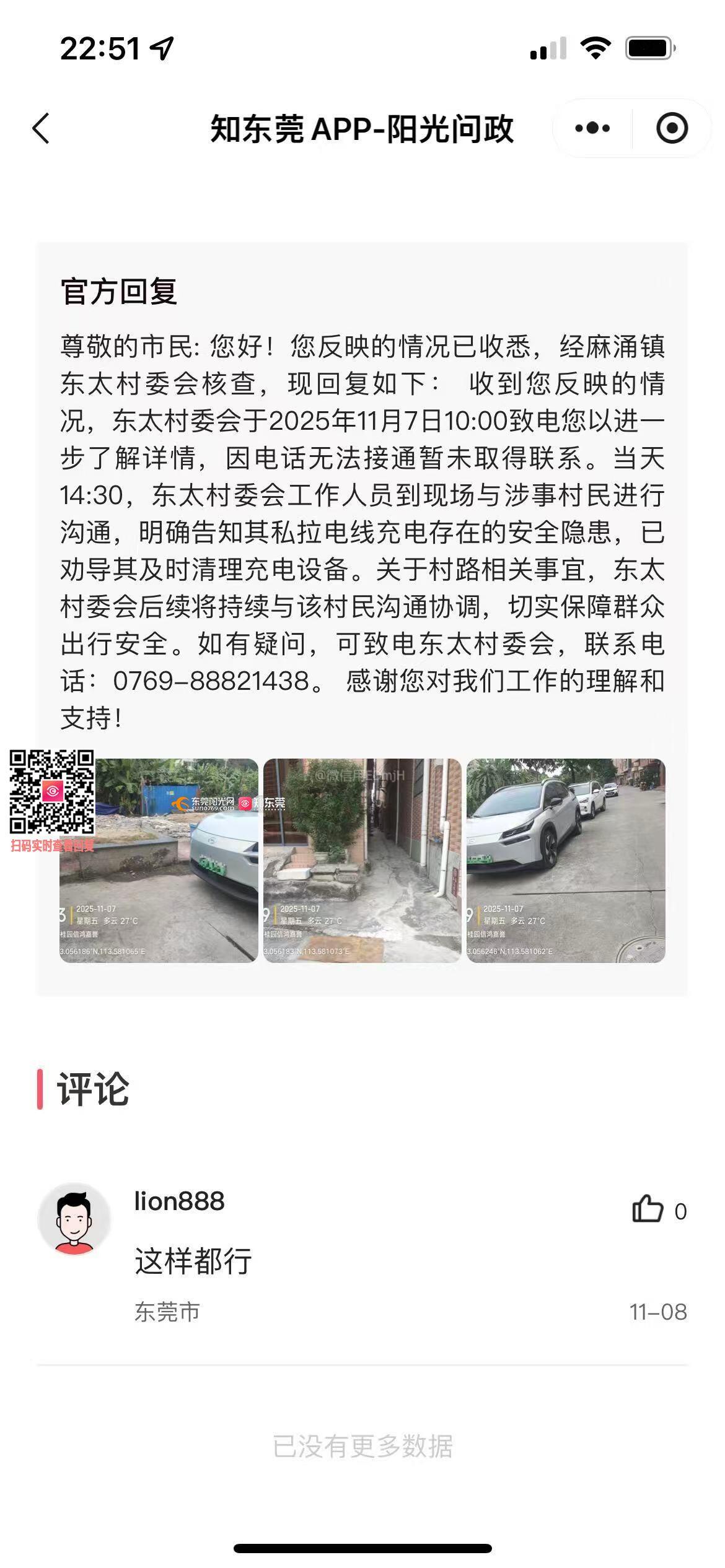 尊敬的市民: 您好!您反映的情况已收悉,经麻涌镇东太村委会核查,现回复如下:收到您反映的情况,东太村委会于2025年11月14日11:00再次与涉事村民沟通,明确告知其私拉电线充电存在的安全隐患,并引导其到专门充电桩充电,目前相关充电设备已清理。东太村委会于2025年11月14日15:06多次致电您说明情况,您的电话均无法接通。如有疑问,可致电东太村委会,联系电话:0769-88821438。感谢您对我们工作的理解和支持!