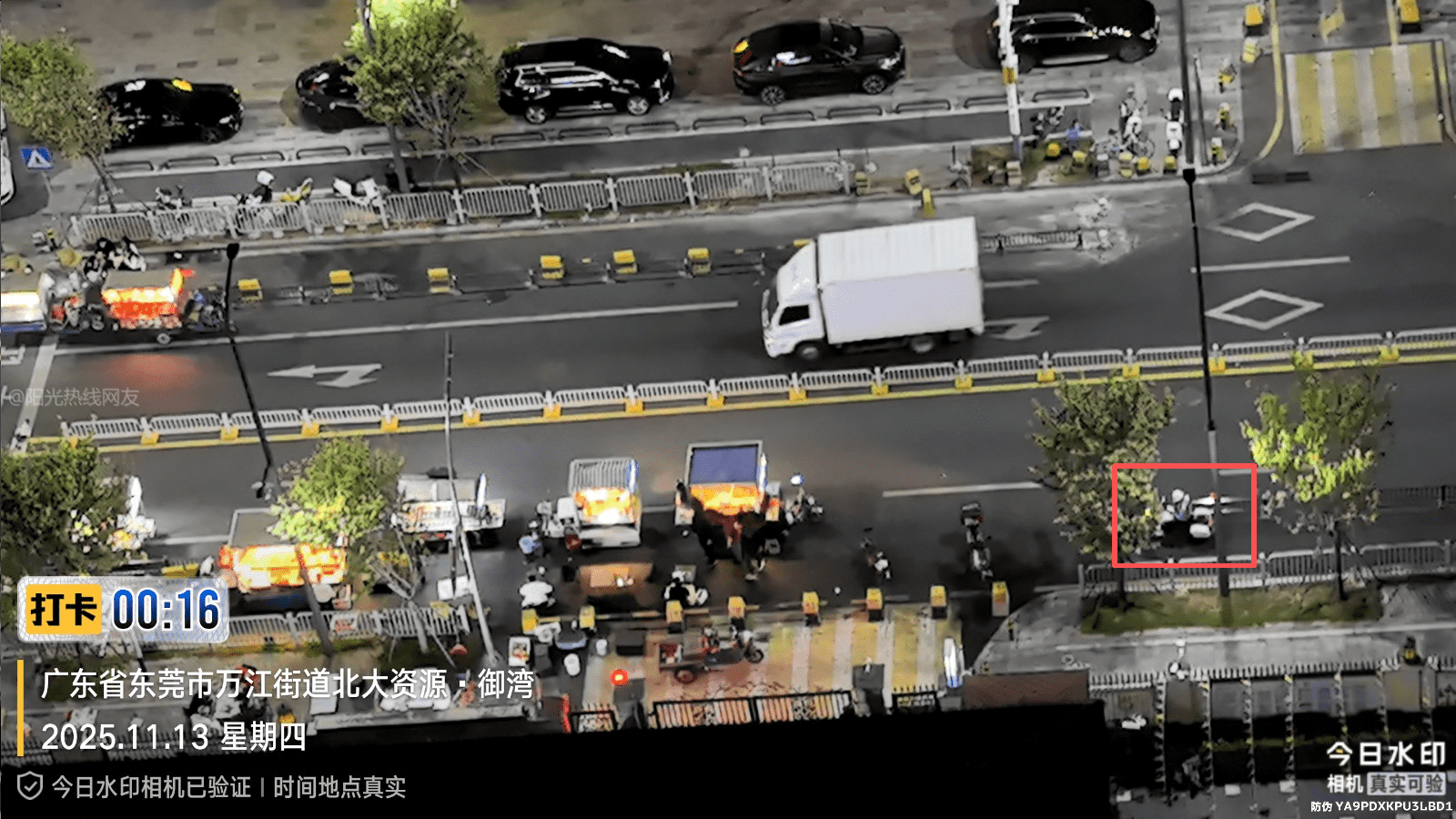 1、时间:每晚11:00-凌晨4:00; 2、地点:位于广东省东莞市万江区37°2PLUS门口流动摊位 3、问题描述: 流动摊位反复滋生,不仅对周边交通造成拥堵、环境脏乱,还存在食品卫生以及消防安全交通安全等多种隐患,日前东莞万江城管分局大张旗鼓的整顿周边流动摊位,请问是做做样子给市民看的吗?并没有做到有效的管理,夜市摊位依旧营业,顾客晚上就餐时的大声喧哗,摇骰盅,锅铲声乒乒乓乓声严重影响住户休息。 4、诉求:“加强夜间巡查(如23时后不定期的突击检查)”“清理遗留垃圾”有关部门切勿做做样子应付群众投诉。 请看下图二:右下角红框框里有一位城管工作人员,在看手机并没有对流动摊位作出劝导教育并劝离。