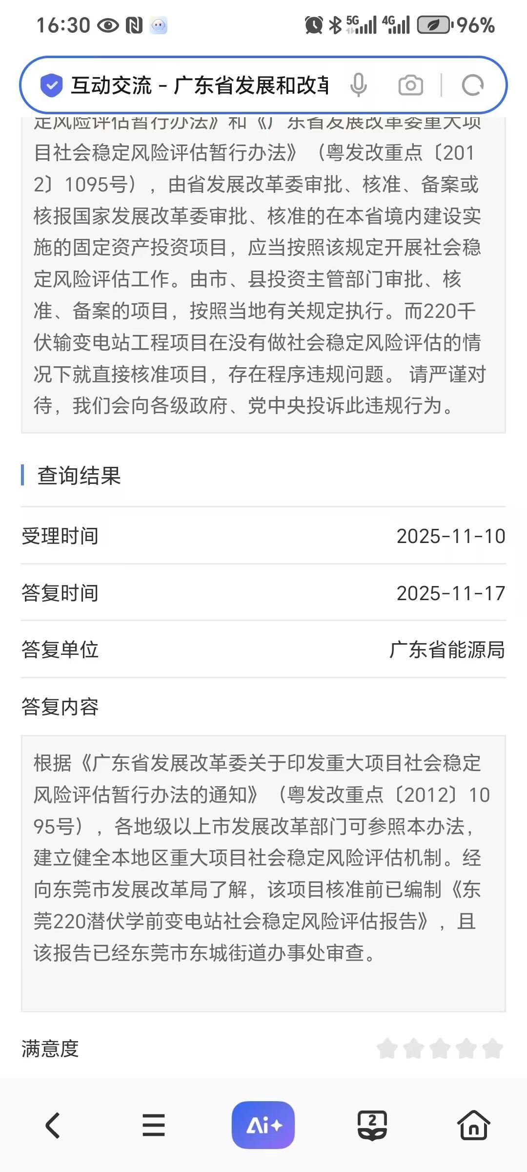 经咨询广东省发改委了解到,东莞220千伏输变电站工程项目核准前已编制《东莞220千伏学前变电站社会稳定风险评估报告》,且该报告已经东莞市东城街道办事处审查。经查询过东莞市发革委等所以相关部门的官网,发现该社会稳定风险评估报告并没有对公众公示,也没有对该项目一墙之隔的年丰山庄进行公示(在2019年时有公示,但因为手续不齐全居民反对而中止,之后并没有公示),所以存在程序违法。