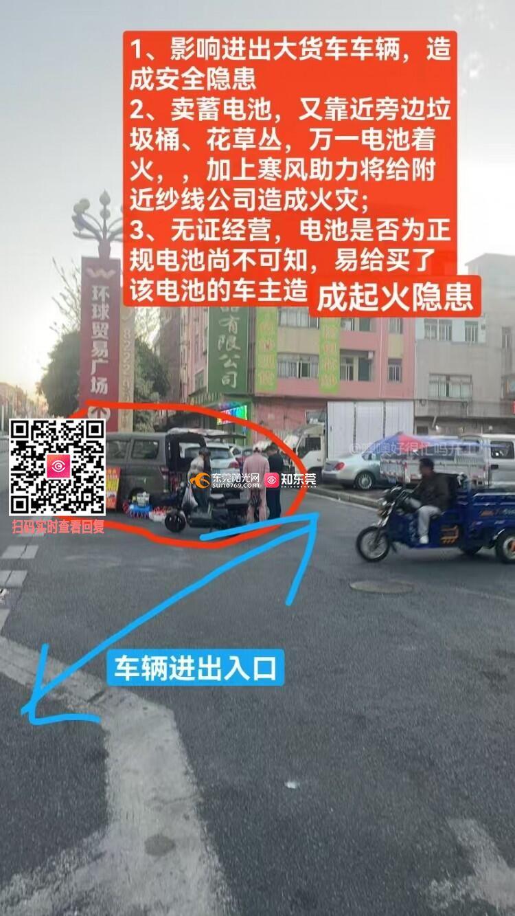相关管理部门: 您好! 现投诉富华北路48号广场车辆出入口处,有摊贩占道售卖汽车蓄电池: 1. 占道阻碍大货车通行,造成交通安全隐患; 2. 摊位紧邻垃圾桶、花草丛,蓄电池若起火,加寒风易波及旁侧纱线公司引发火灾; 3. 该摊贩无证经营,电池合规性存疑,易致车主使用时起火。 请贵部门尽快处置,让该摊贩撤离此处摆摊,消除安全隐患。