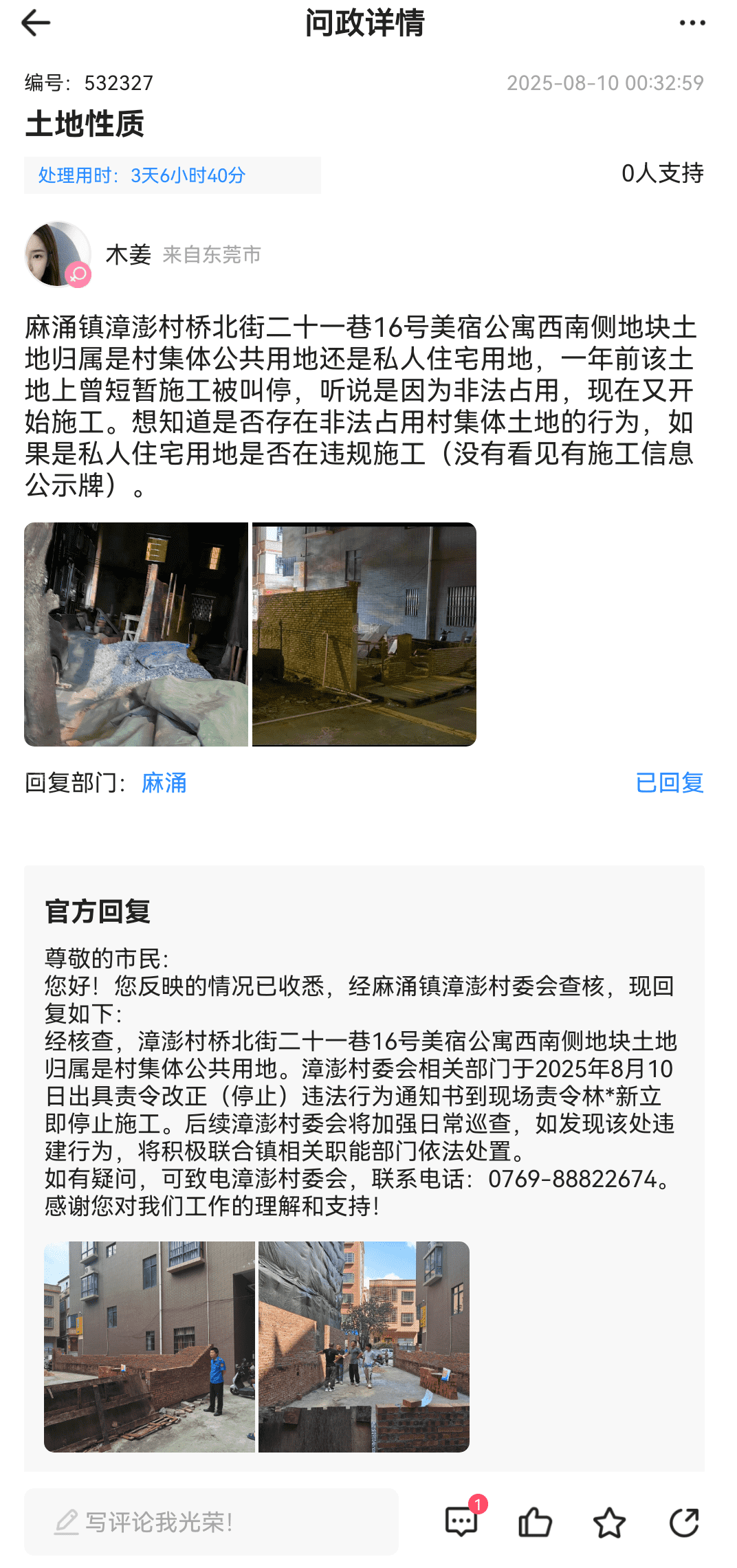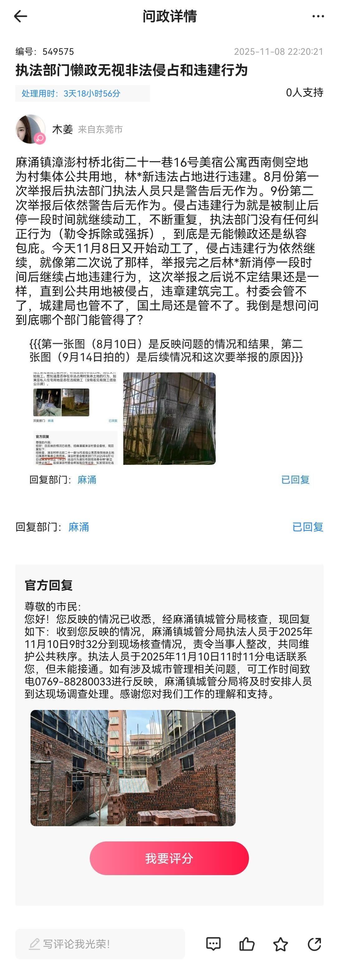 漳澎村桥北街二十一巷16号美宿公寓西南侧空地为村集体公共用地,林*新违法占地进行违建。多次举报反映问题执法部门只有敷衍的巡看后没有任何作为,违建体是停工后歇停一阵继续动工,重复了三次。看图就可以看到8月份到现在被侵占地上违建体的变化,到现在都已经开始用铁皮封顶了(外面有网布遮盖不好拍照),到底是社会的问题还是人的问题,被你官方定性为违法行为但从来没有真正的执法纠正,是不是到最后就是不了了之???