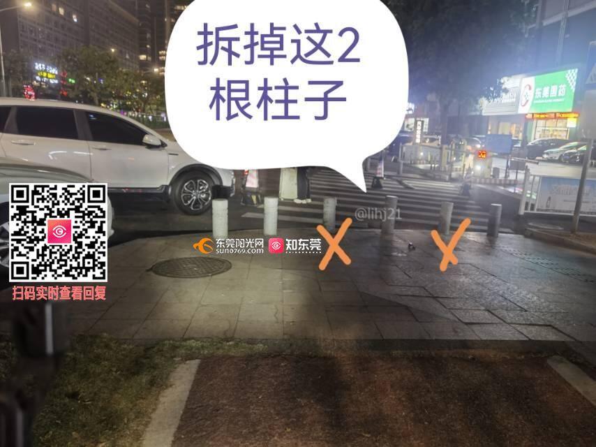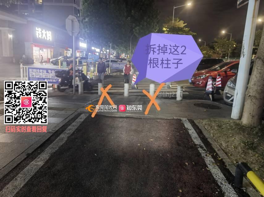 路口的挡车桩设置太密,导致骑车通过时小朋友腿被碰伤,请市政部门调整路桩设置,减少部分路桩(与绿道的宽度一致合理),谢谢。