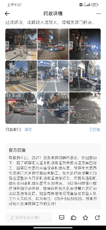 厚街该路段乱停乱放,占道经营,道路不通经反映,政府无任何改善措施。 反映这段时间,没有一分钟该路段是通畅的,非机动车道全是车,说得好听,但是没有行动。