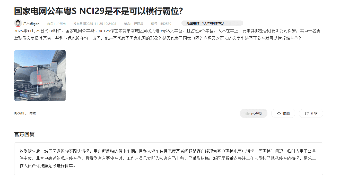本人于2025年11月25日发起问政,于2025年11月27日得到官方回复,对此回复非常不满,官方存在避重就轻敷衍了事之嫌。 ——主要内容:2025年11月25日约18时许,国家电网公车粤5NCI29停在东莞市南城区周溪大道9号私人车位,且占位4个车位,人不在车上,要求其都走否则要叫公司保安,其中一名男驾驶员态度极其恶劣,并称叫保也没在怕!请问,他是否代表了国家电网的形象?是否代表了国家电网的立场及对群众的态度?是否开公车就可以横行霸车位? ——官方回复:收到诉求后,城区局迅速核实跟进情况。用户所反映的供电车辆占用私人停车位且态度恶劣问题是客户经理为客户更换申表电话卡,因更换时间短,临时占用了公共停车位,非客户表述的私人停车位。目看到客户要停车时,工作人员已立即告知客户马上移。已采取措施:城区局将重点关注工作人员按照规范停车的情况,要求工作人员严格按照划线进行停车。 ——存在问题: 1、客户经理所谓的公用停车位并不属实,此停车位为东莞市城巴运输有限公司租的停车位,主要提供给内部工员停放。 2、临时停用可以理解,为何要一车占四位? 3、退一万步讲,哪怕是公用停车位,是否就可以出言不逊态度恶劣?是谁给的底气?