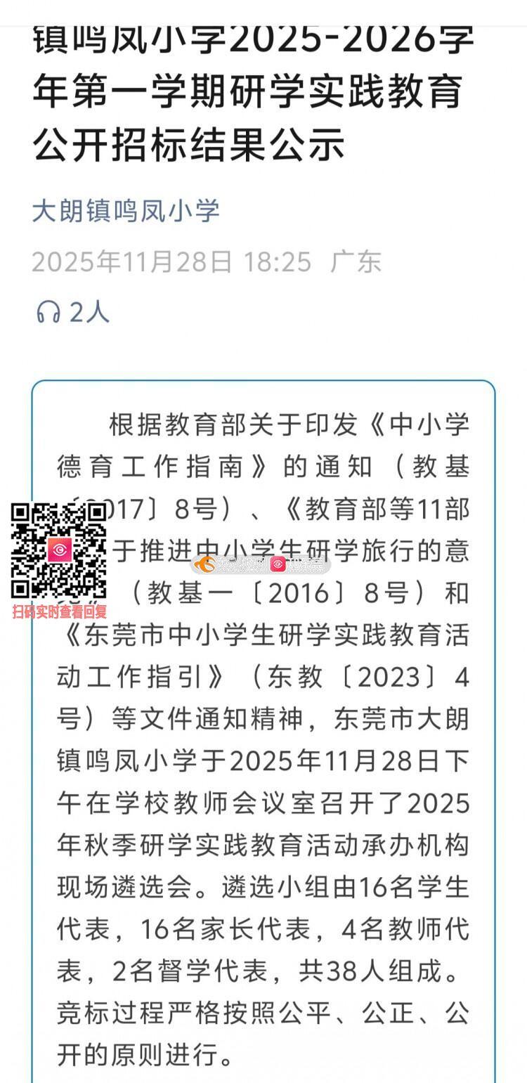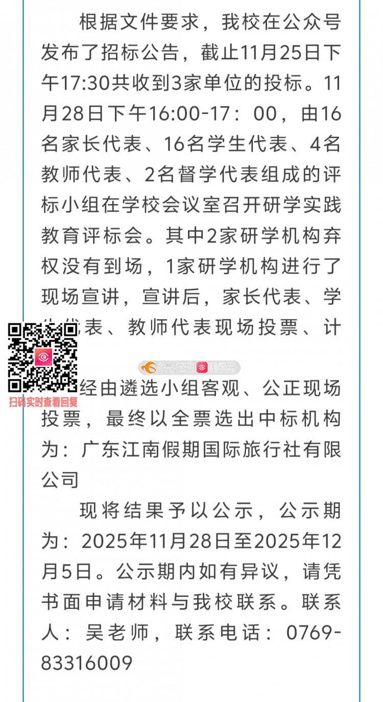 尊敬的市民,您好!您反映的问题已收悉,我中心高度重视,迅速组织人员核查相关情况。我中心已于12月3日下午17时左右联系您,但电话未接通,现就相关情况回复如下: 该校于11月19日发布2025年秋季研学实践教育活动招标公告,截至11月25日共收到3家单位的投稿。学校经审核相关材料,3家单位均符合要求并分别通过电话和邮件通知其参加现场遴选宣讲,不参加者视为放弃遴选。该校根据要求于11月28日下午16:00召开了研学第三方机构遴选评审会议。其中2家研学机构超过遴选报到时间没有到场,同时学校经电话确认,没到场的2家公司放弃遴选。根据要求,遴选评审会议要对投稿的公司进行评审,如家长对相关公司的课程或安排等不满意,可不投票。我中心查看本次遴选会家长投票情况,符合要求。 我中心将继续督促学校严格落实研学相关规定。如有问题,请与教育管理中心联系,联系人:韩老师,联系电话:81230992。感谢您对我们工作的支持与理解!