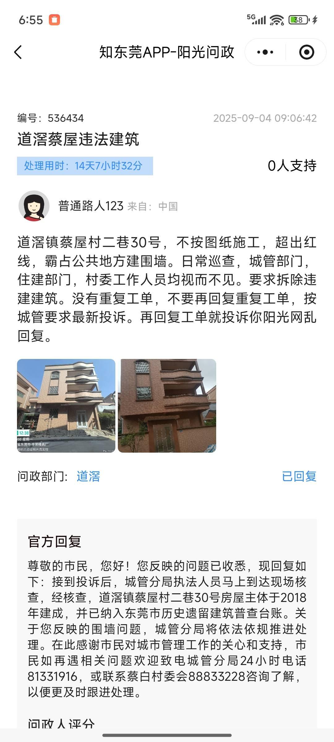 举报违法建筑,道滘城管回复依法处理,3个月都没有一点措施,公然包庇违法建筑行为。要求纪检部门调查,追责到人。