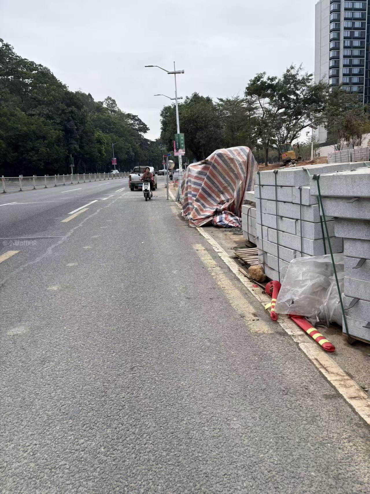莞长路瑧山境路段长期占道施工,非机动车道还没有建好使用,但是临时防护围栏已拆,