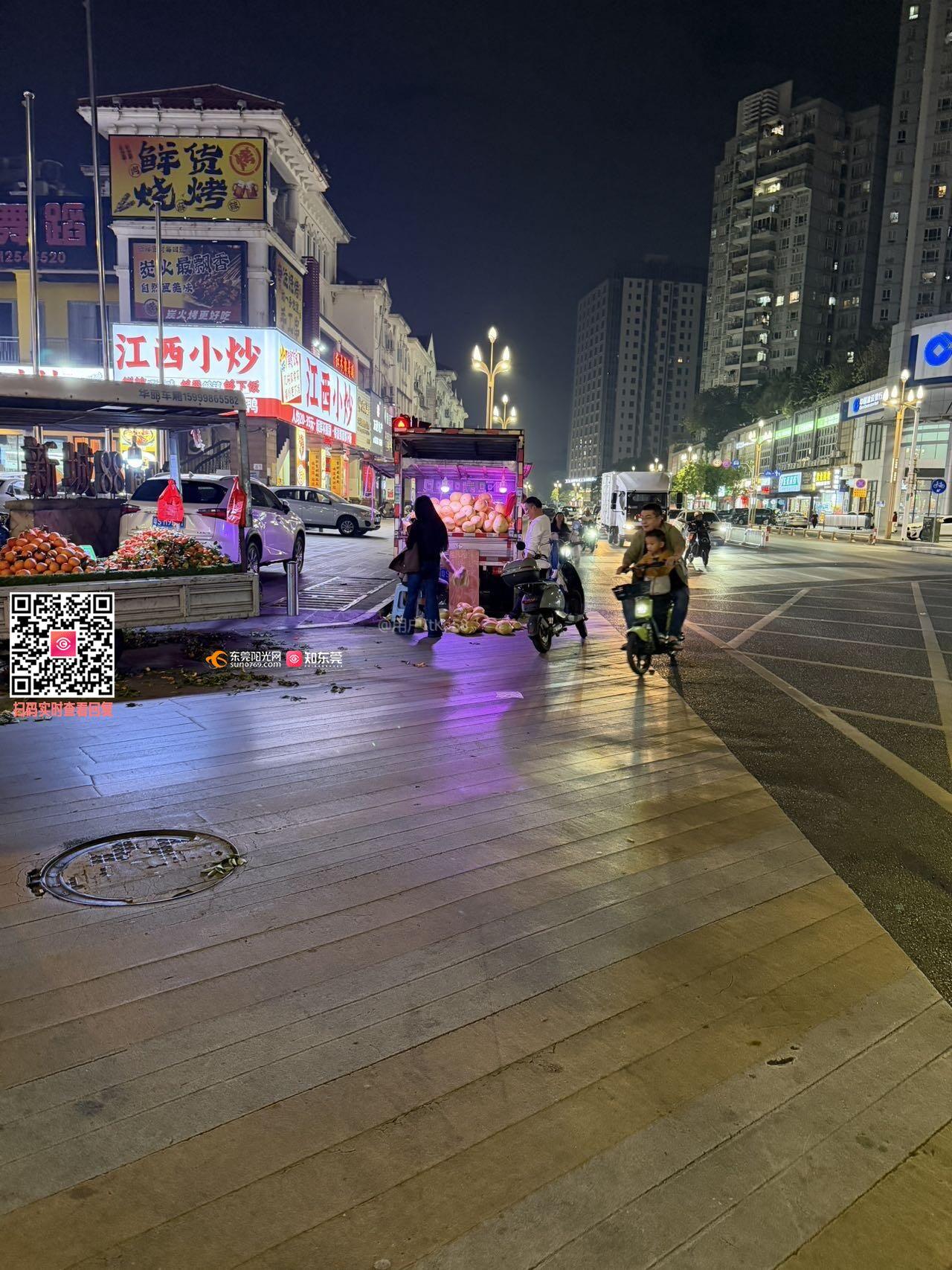 这两个买水果的车天天晚上占用车道,且用大喇叭叫卖