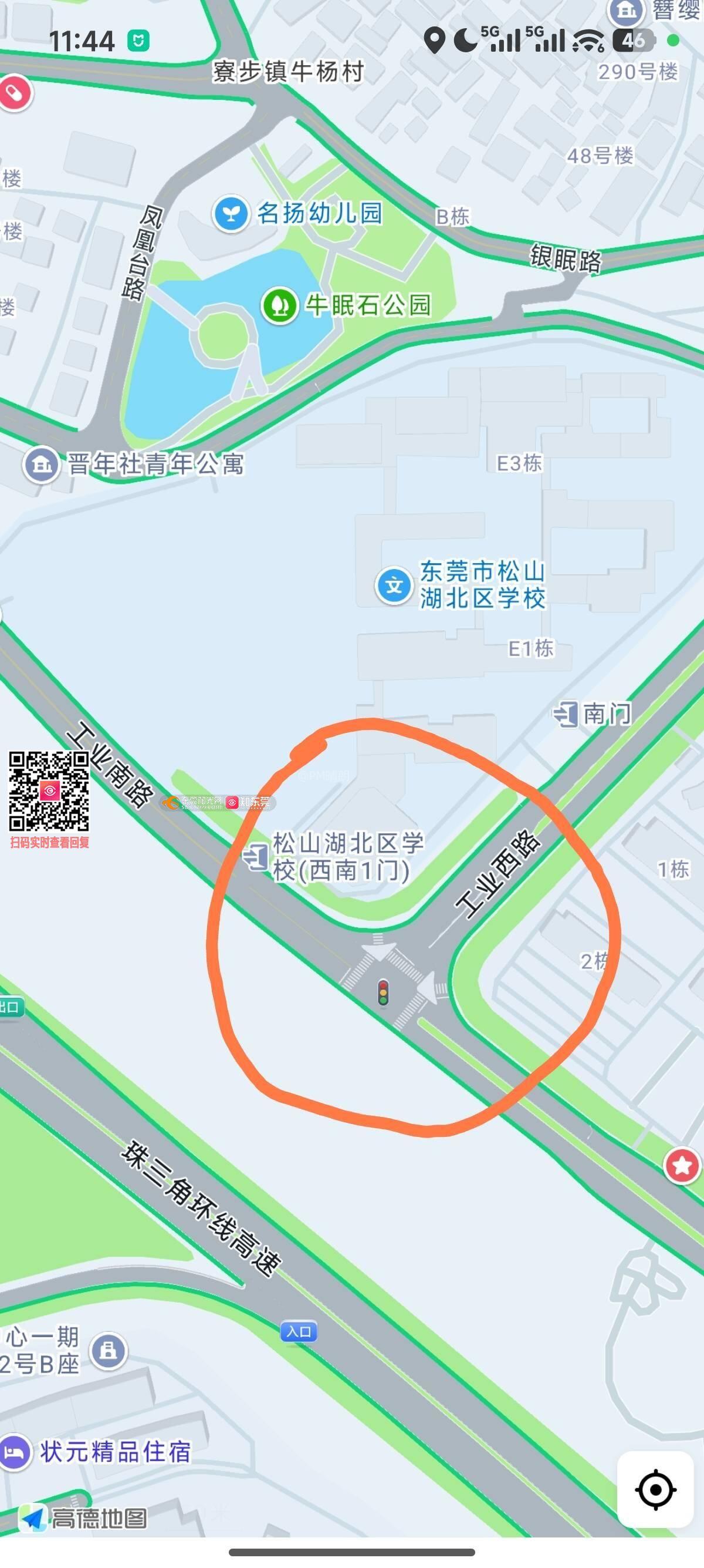 松山湖北区学校对出红绿灯(工业西路与工业南路交叉路口红绿灯),该路口为T字路口,工业南路西往东方向,红绿灯放行不合理,目前情况是左转绿灯时直行红灯,直行绿灯时左转红灯。左转车辆和直行辆互不干扰的,左转和直行可以同时放行互不影响。 建议修改: 工业南路西往东,左转和直行红绿灯应该修改为同时红灯或同时绿灯,左转和直行应该同时放行,方能改善交通拥堵问题。谢谢