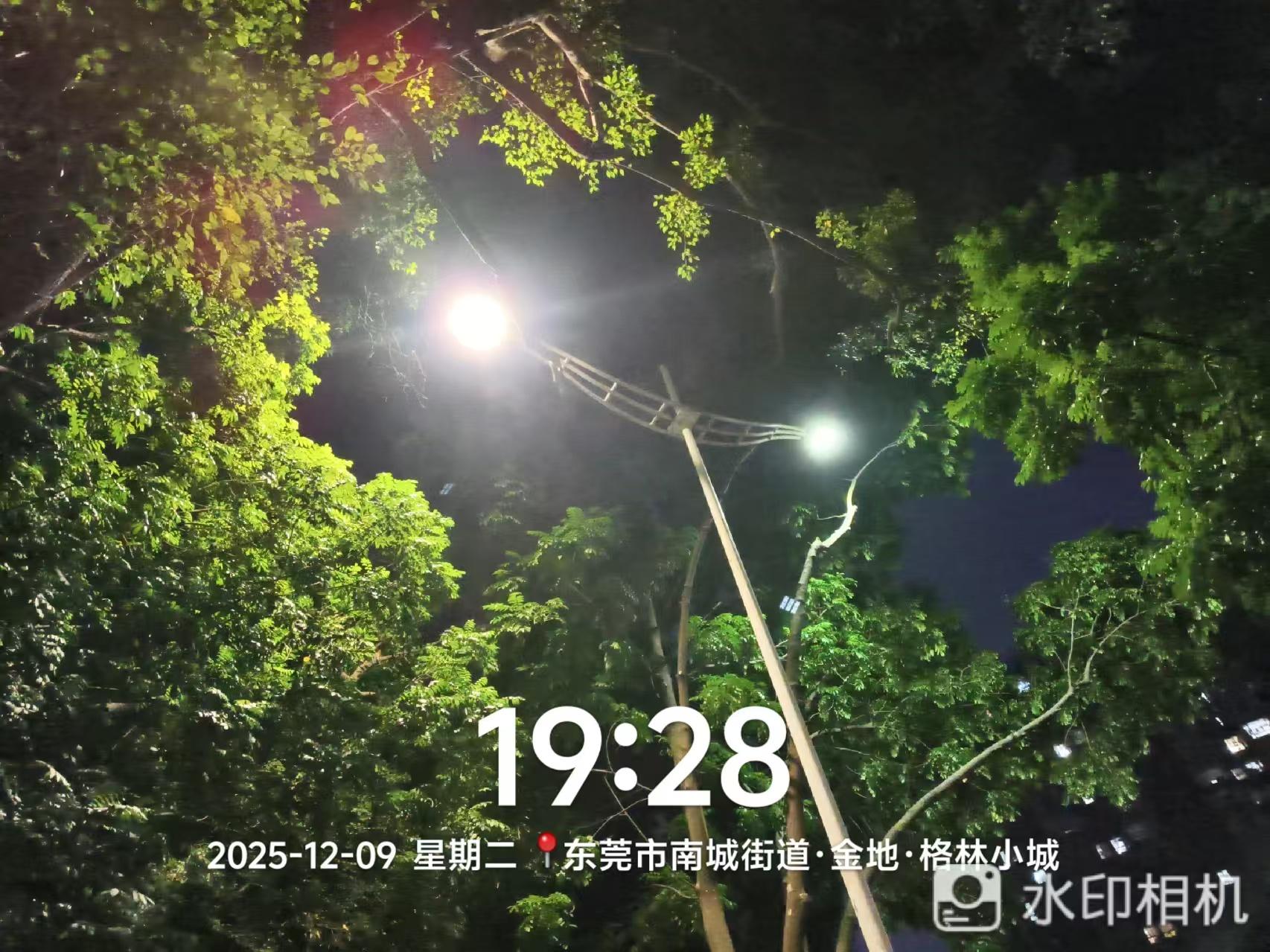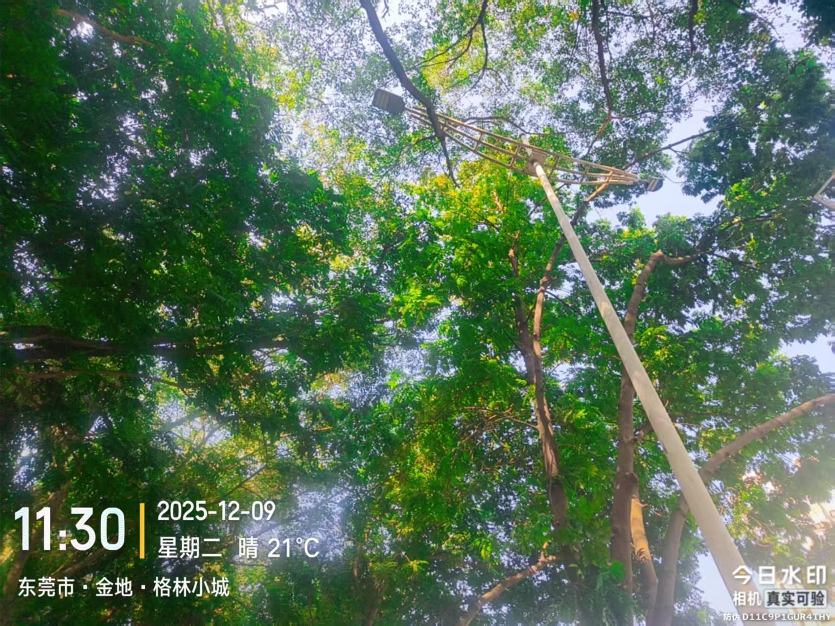 如图所示,这段路晚上特别黑,树叶把灯挡得死死的,这边的路也坑坑洼洼。 希望要么把树砍了,要么新设几个路灯。