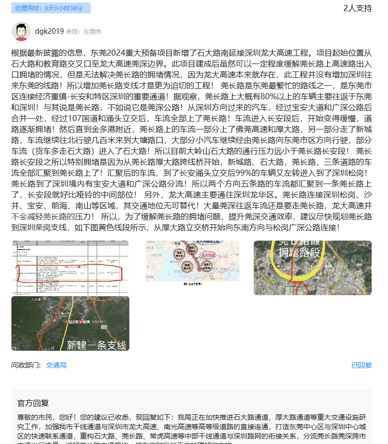 各位政府的领导您们好,关于莞长路(长安至大岭山段)拥堵问题已经成了广大市民心中的最大痛处,天天堵,年年堵,节日堵,上下班堵,交通意外那更是家常便饭,行走路上真是叫天不应叫地无门,天天都是春运!哪怕有另外一条收费的高速路也好啊,答案是没有,就这一条路,广大市民也反馈了无数次(请见截图),恳请市领导能够调研,开辟一条新路连接长安和大岭山(哪怕收费那),以缓解市民的通行之苦!