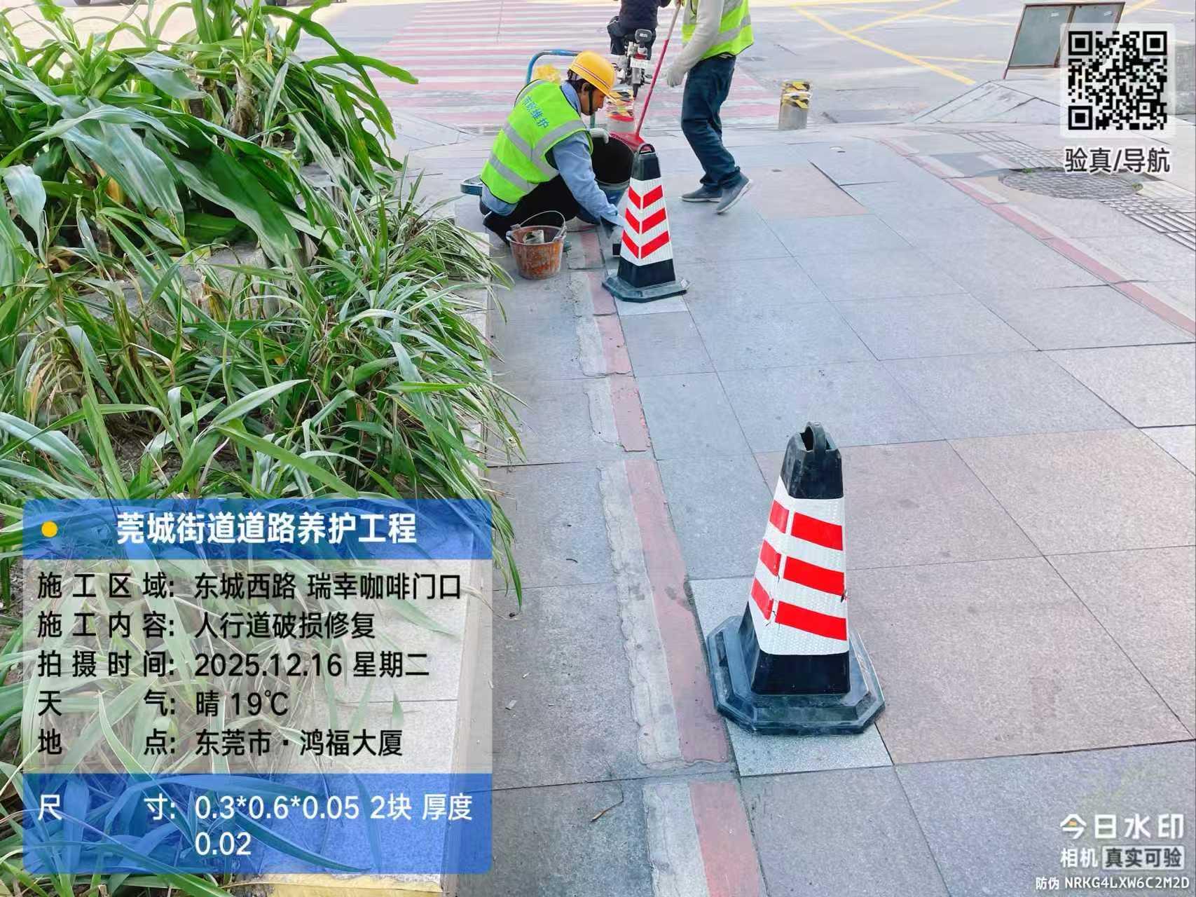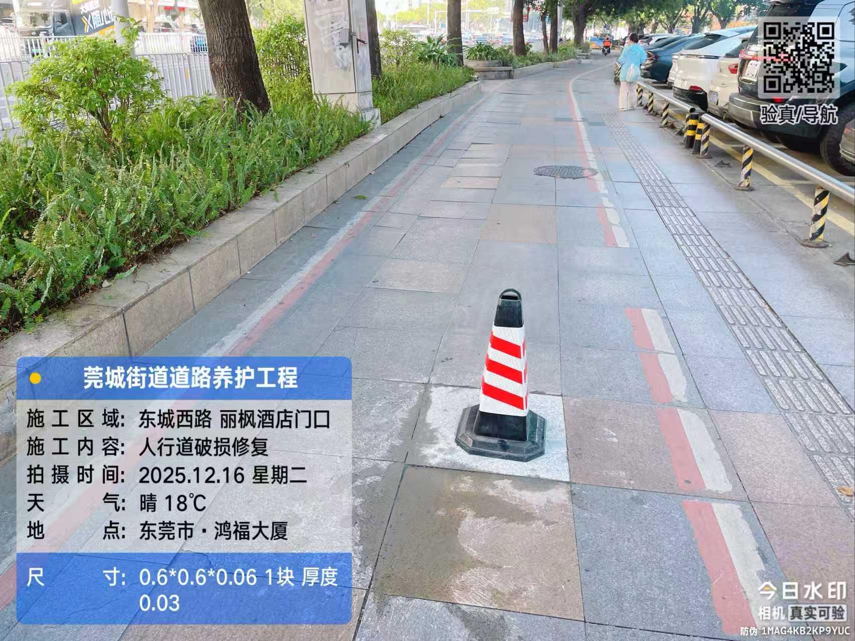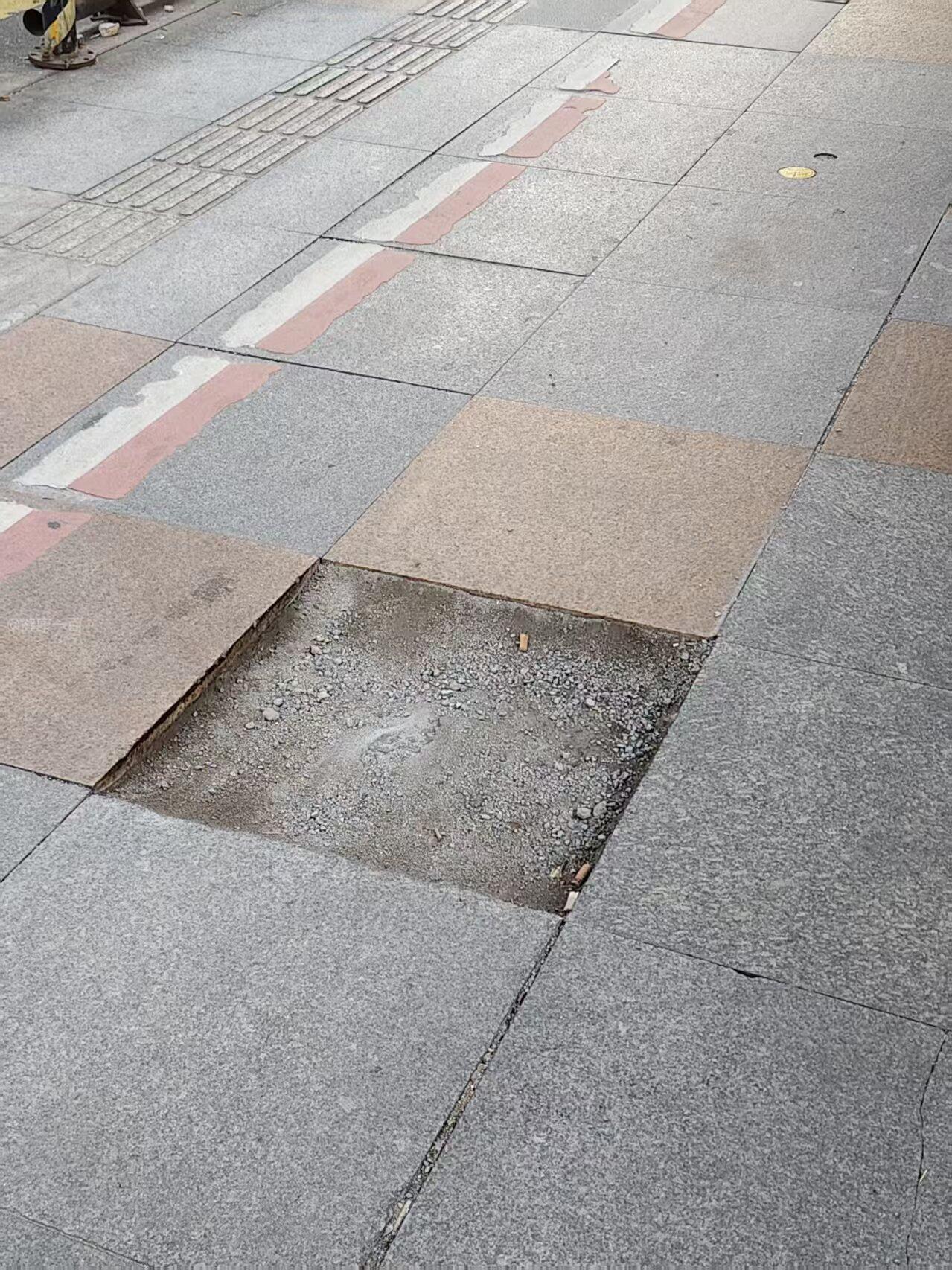 莞城街道东城西路1号(丽枫酒店前面)人行道破损,请修补