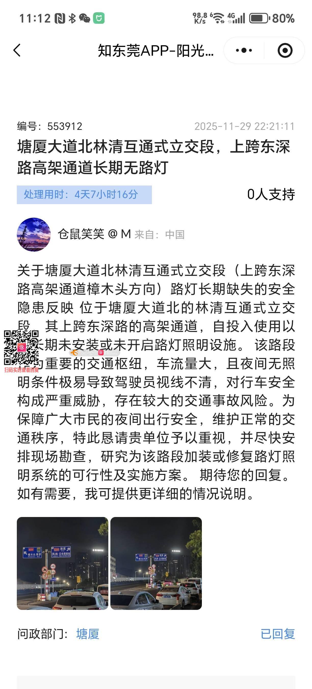 再次反馈,不是东深路路灯不亮,是塘厦往樟木头方向塘厦大道北林清互通式立交上跨段无照明设施(下图红色路段)之前回复的拍摄路段与本人投诉路段不符,上次投诉编号为:553912 关于塘厦大道北林清互通式立交段(上跨东深路高架通道樟木头方向)路灯长期缺失的安全隐患反映位于塘厦大道北的林 清互通式立交段,其上跨东 深路的高架通道,自投入使用以来长期未安装或未开启路灯照明设施。该路段作为重要的交通.枢纽,车流量大,且夜间无照明条件极易导致驾驶员视线不 清,对行车安全构成严重威胁,存在较大的交通事故风险。为保障广大市民的夜间出行安全,维护正常的交通秩序,特此恳)请贵单位予以重视,并尽快安排现场勘查,研究为该路段加装或修复路灯照明系统的可行性及实施方案。