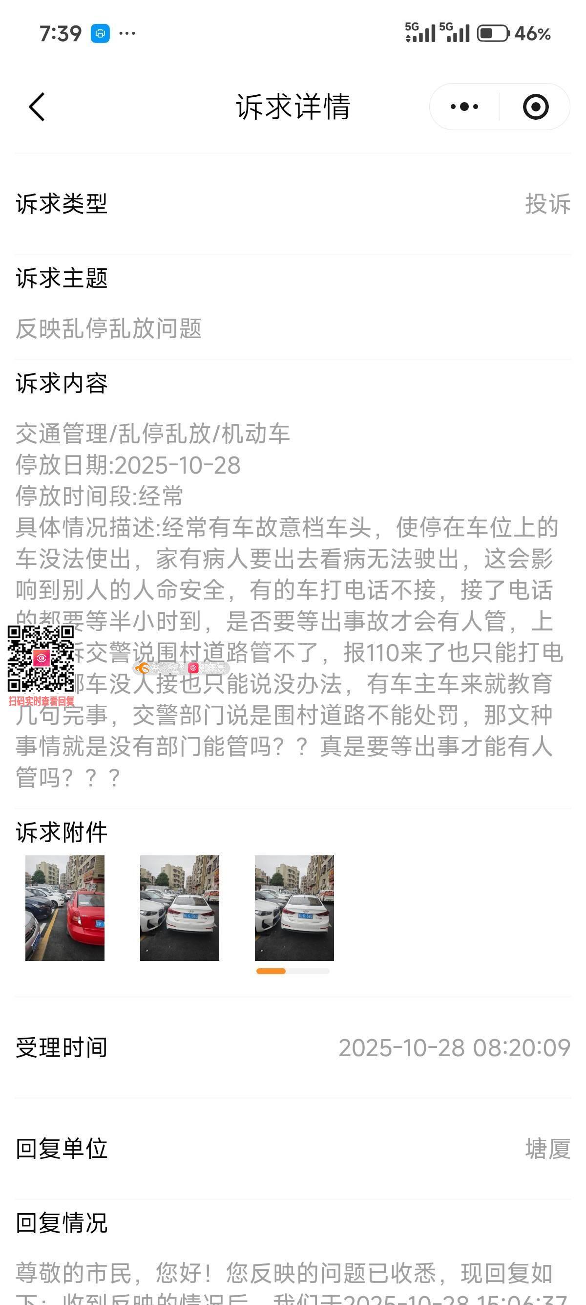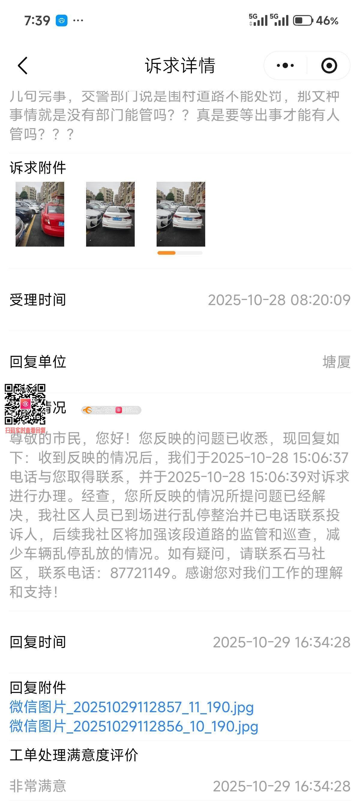 多次12345投诉石马社区乱停乱放问题一直处理不好,一直有车档住别人的车出不去,有打电话车主不接,报警交警说围村道路他也没办法不能处罚,围村处理不好几年一直这样,那这现象就一直这样吗,是不是每个车主在围村乱停乱放就没部门能管呢,就变成东莞文明城镇的一道风景了吗???这到底是那个部门能处理呢?