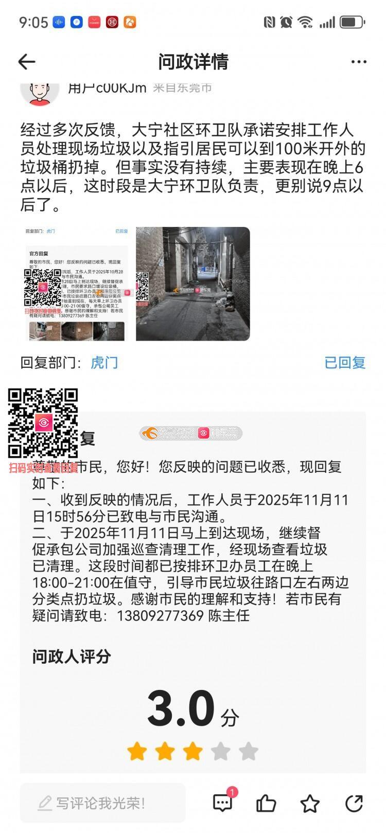 经过多次反馈,大宁社区环卫队承诺安排工作人员处理现场垃圾以及指引居民可以到100米开外的垃圾桶扔掉。但事实没有持续,主要表现在晚上6点以后,这时段是大宁环卫队负责,晚上9点以后更加恶劣。