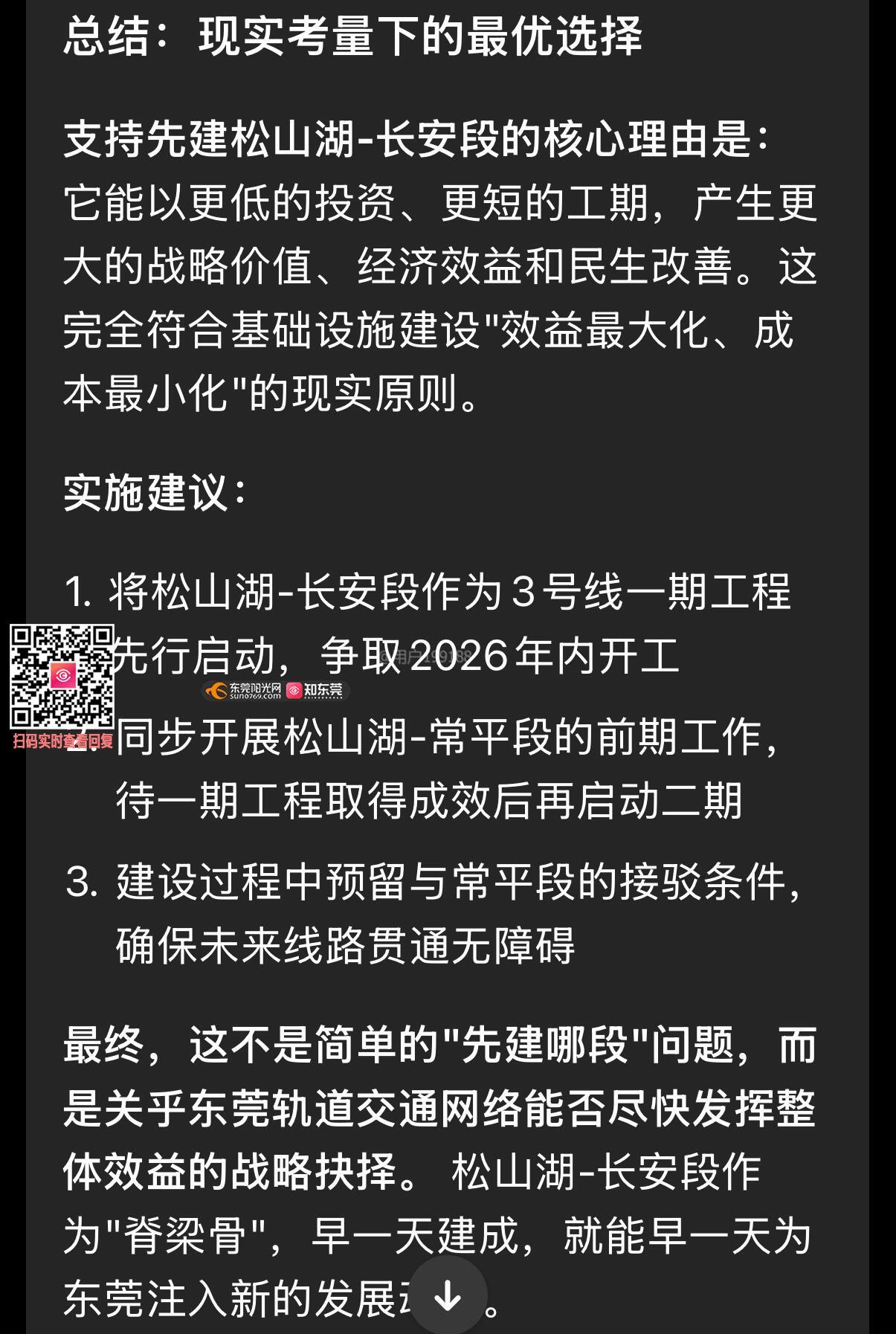 地铁3号线“松山湖-长安段先行”的现实理由如下: 一、战略价值:构建“黄金脊梁” 交椅湾站(与2号线三期换乘)、松山湖站(核心枢纽),尤其是长安站可对接深圳地铁11号线碧头站,形成“深莞15分钟交通圈”。同时,它串联了松山湖科技产业带与长安制造业基地两大千亿级产业集群,是东莞轨道网络“闭环成网”的关键。 二、客流刚需:通勤需求迫切 现状交通已不堪重负:松山湖新城路往长安方向匝道因车流超设计容量而“经常性拥堵”。客流基础雄厚:松山湖北站暑运期间到发旅客超73万人次;长安镇常住人口超100万,为东莞人口第一大镇,与松山湖间通勤需求旺盛。此外,该通道是大量深圳白领往返松山湖的主要走廊,跨城通勤需求巨大。 三、经济效益:投资回报更高 该段覆盖区域GDP总和约占全市40%,单位投资经济拉动效应显著。沿线站点(如长安站、松山湖站)TOD开发潜力大,可形成“地铁经济圈”。根据中山大学研究,“地铁+停车”为最优通勤模式,该段建成后预计日均客流可达2万人次以上,商业与客流效益明确。 四、建设可行性:工期更短、难度可控 相比常平段,该段地质条件相对平坦(避开复杂隧道群),施工难度较低。长安与松山湖新区地下管网相对规整,施工干扰小。部分路段可采用高架或地面敷设,拆迁成本低于常平老城区。综合来看,其建设周期预计可缩短1-2年。 五、替代方案:延后常平段无交通真空 现有交通体系可提供过渡保障:莞惠城轨已覆盖松山湖-常平区域,提供公交化服务;环莞快速路三期预计2026年完工将缓解压力;另有多条公交线路(如306路)连接。 结论与建议 先行建设松山湖-长安段能以更短工期、更低投资,更快实现战略价值、经济效益与民生改善。建议将其作为3号线一期工程优先推动,争取2026年内开工,并为后续衔接预留条件。