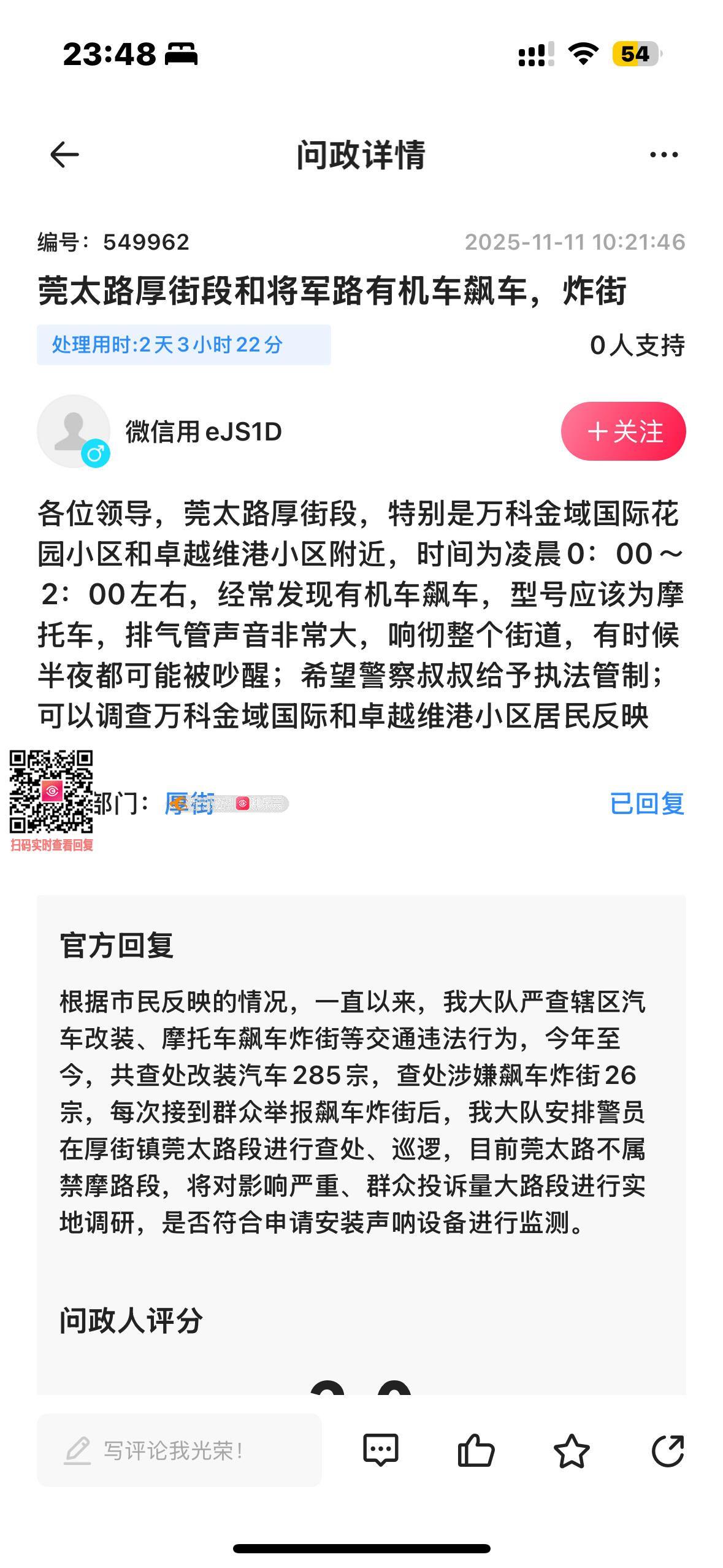 根据《莞太路厚街段和将军路有机车飙车,炸街》(编号:549962)(见附件),莞太路、将军路常年存在机车凌晨飙车扰民的交通乱象,且投诉帖子发出至今长达一个月,该飙车扰民现象非但未得到遏止,反而愈发猖獗,附近居民起居生活受到严重影响,可见贵大队于问政意见栏的回复“我大队安排警员在厚街镇莞太路段进行查处、巡逻”未能解决群众反映的问题。为根治凌晨飙车扰民的交通乱象,还群众一个安居乐业的清净环境,恳请贵大队执法为民的同时重点关注民生问题,认真研究“将对影响严重、群众投诉量大路段进行实地调研”调研报告,在莞太路、将军路铺设声呐设备进行监测,切实解决群众之急。特此建议
