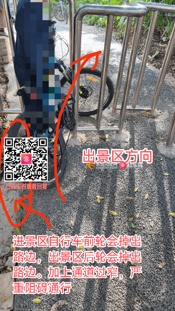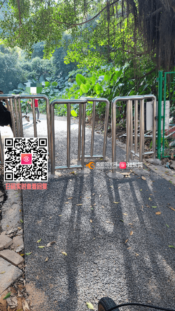 万科汉邦松湖半岛后面小路进入松山湖景区的门岗空隙设置过窄,自行车出行严重不便。本来此处是为了防止电动车进入景区,不仅增加了保安还安装了门岗,但是此处路窄还装了三个L型栏杆留了两个过道,西侧过道严重狭窄根本过不了自行车。东侧过道也过窄推自行车出入严重受阻,且由于靠近路边了,车头刚出去就会直接掉到路边,更让自行车难以出去。希望景区能去掉一个L型栏杆,缩小剩余两个栏杆的间距让自行车可以轻松进入即可,或者去除L型栏杆,安装与其他湖边出入口一致的柱形栏杆,测试好电动车不能过,自行车容易过即可。不要因噎废食,因为过于担心个别的电动车问题而给大量选择自行车出行的群众造成不便,况且你们还雇了个保安离门岗三米都不到。