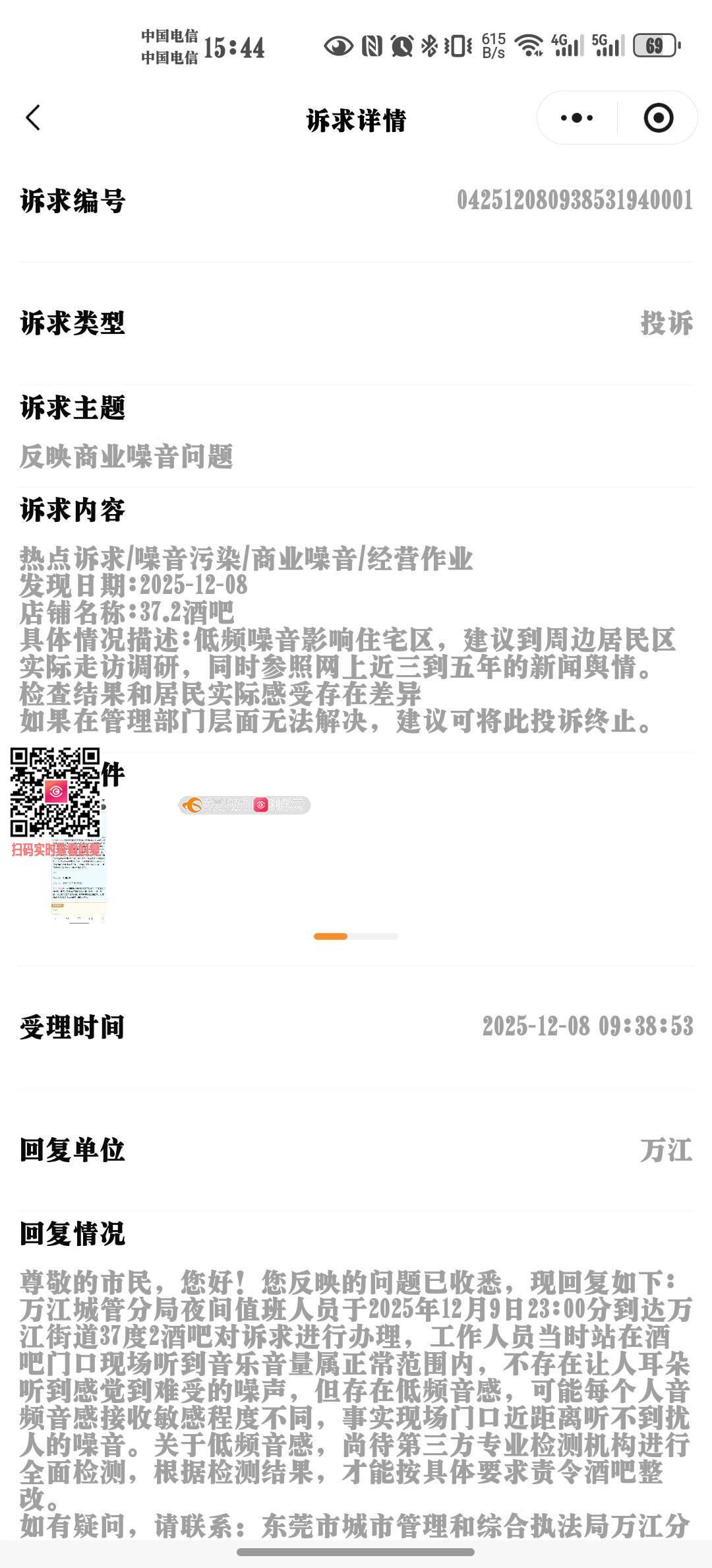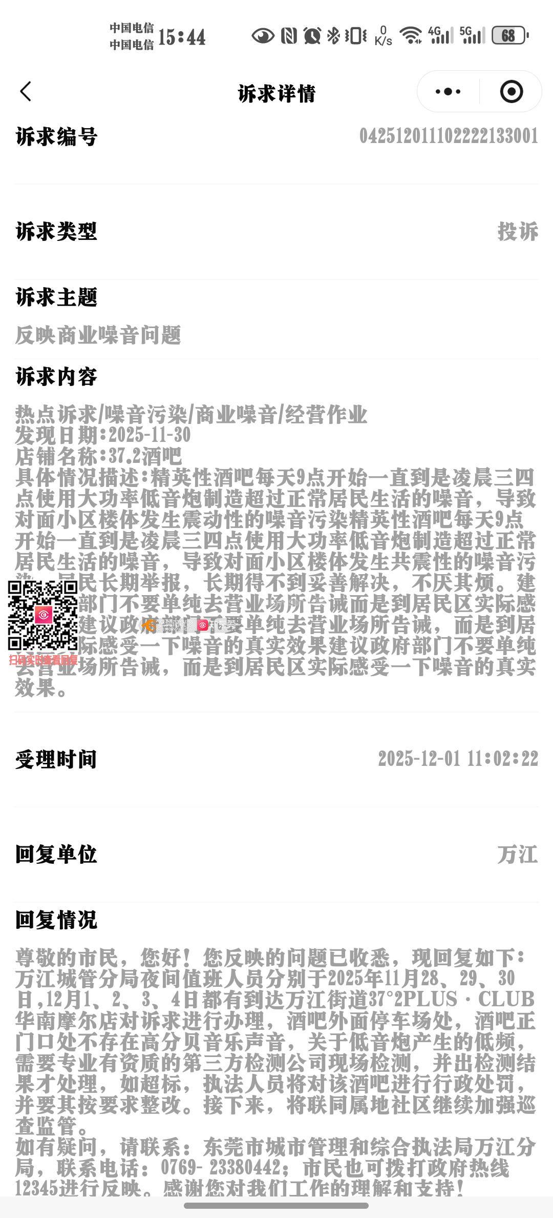 尊敬的市民,您好!您反映的问题已收悉,现回复如下: 万江城管分局夜间值班人员于2025年12月16日23:03分到达万江街道37度2酒吧对诉求进行办理,工作人员当时站在酒吧门口现场听到音乐音量属正常范围内,不存在让人感觉到难受的噪声,但存在低频音感,由于每个人音频音感接收敏感程度不同,加上现场门口近距离也听不到扰人的噪音,所以随即离开。至关于低频音感,需待第三方专业检测机构进行全面检测,根据检测结果,再按具体要求责令37度2酒吧整改。接下来,将联同属地社区继续加强巡查监管。如有疑问,请联系:东莞市城市管理和综合执法局万江分局,联系电话:0769- 23380442;感谢您对我们工作的理解和支持!