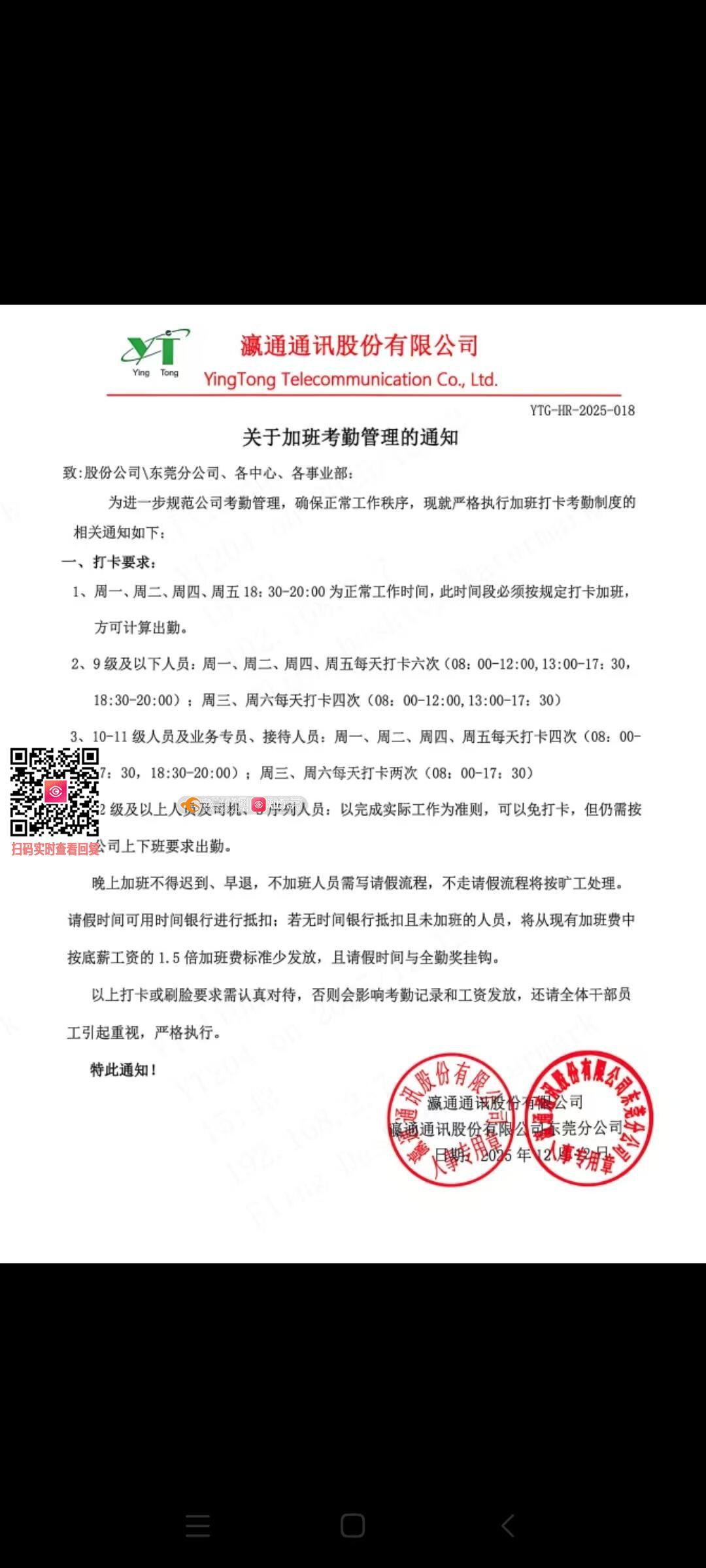 尊敬的相关单位领导,请查阅附件,东莞市常平镇瀛通通讯股份有限公司通知,老板强制周一,二,四,五晚上义务免费加班1.5小时(18:30~20:00)按正常工作时间规定打卡,厂里职员都是拿月薪,劳动合同上白纸黑字写白天8小时工作时间,晚上没有加班费的,员工才有加班费,人在做天在看因果轮回迟早要还回,不是不报只是时间未到。请各位领导明查为我们平民百姓主持公道取消加班或按劳动法平时算1:1.5的加班费,公司地址:广东省东莞市常平镇京九路333号,如后面仍未合理解决我们会一直上访有关部门,谢谢!