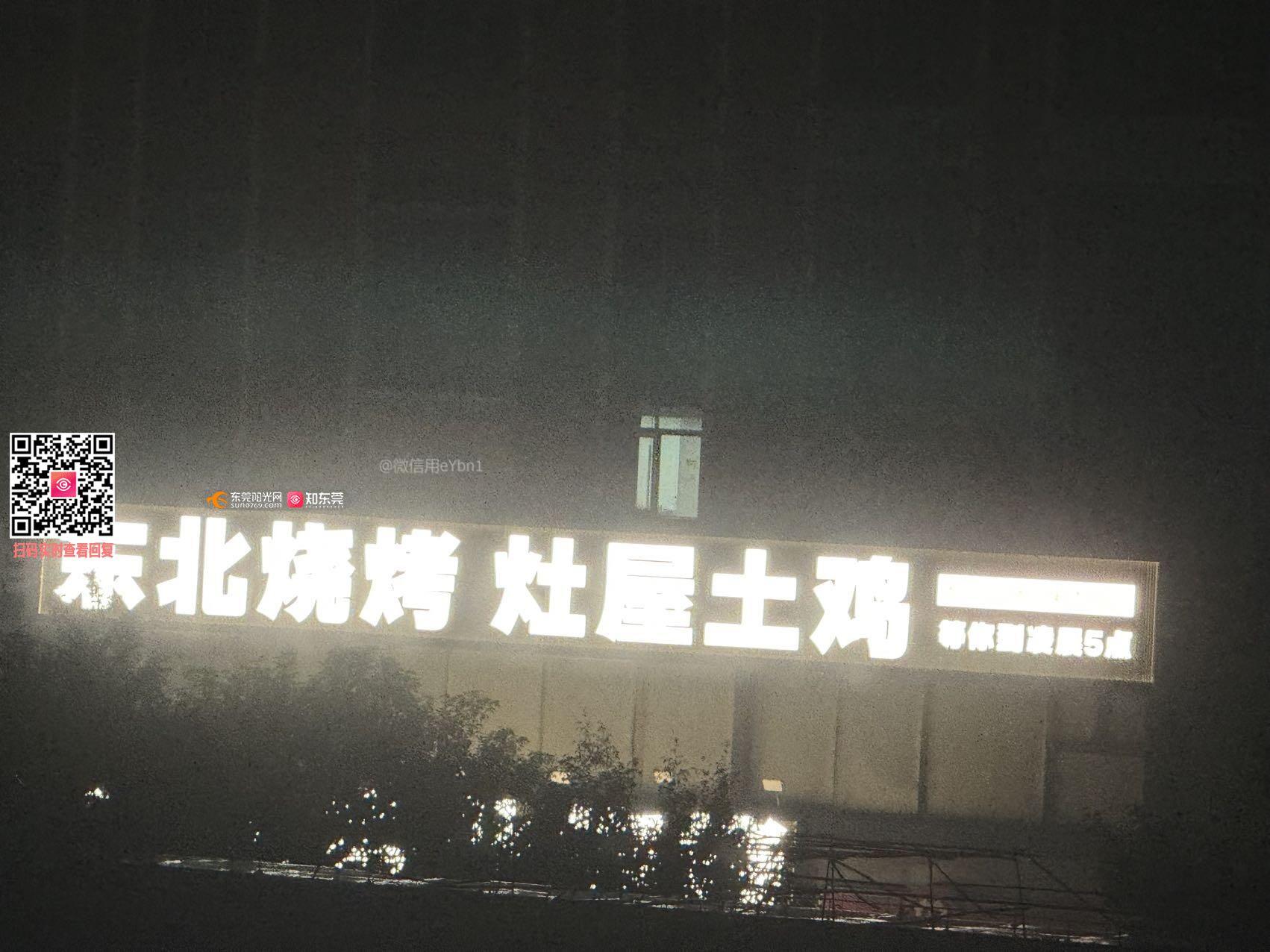 东莞南城街道众利路“东北烧烤 灶屋土鸡”店的发光字招牌,又大又刺眼,每天整晚整晚的亮着,我就住在对面小区,很刺眼很不舒服,望有关部门经快处理。