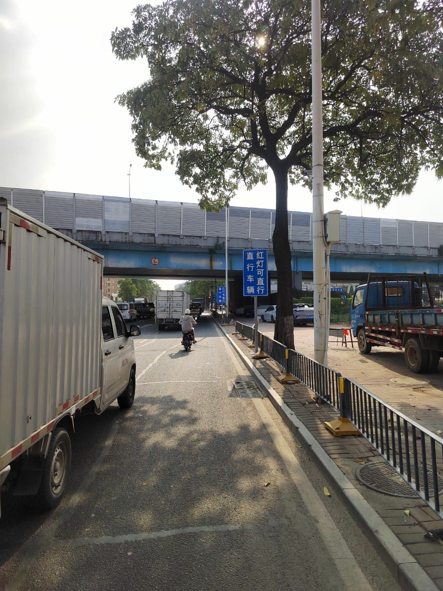 图是从对面方向拍的。杨朗路由东向西,在松山湖南高速收费站路口,红灯可直行标识装得太靠后了,直行车在停止线上看不到标识牌,导致经常看到直行车停在路口等灯,建议在该红绿灯处也增加“红灯可直行”标识,让停止线上的车也可以看到标识