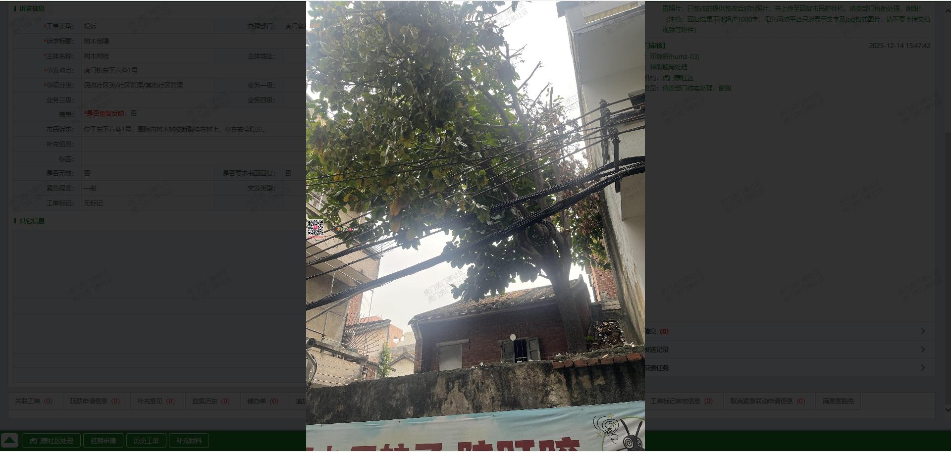 位于东下六巷1号,围院内树木树枝断裂挂在树上,存在安全隐患。