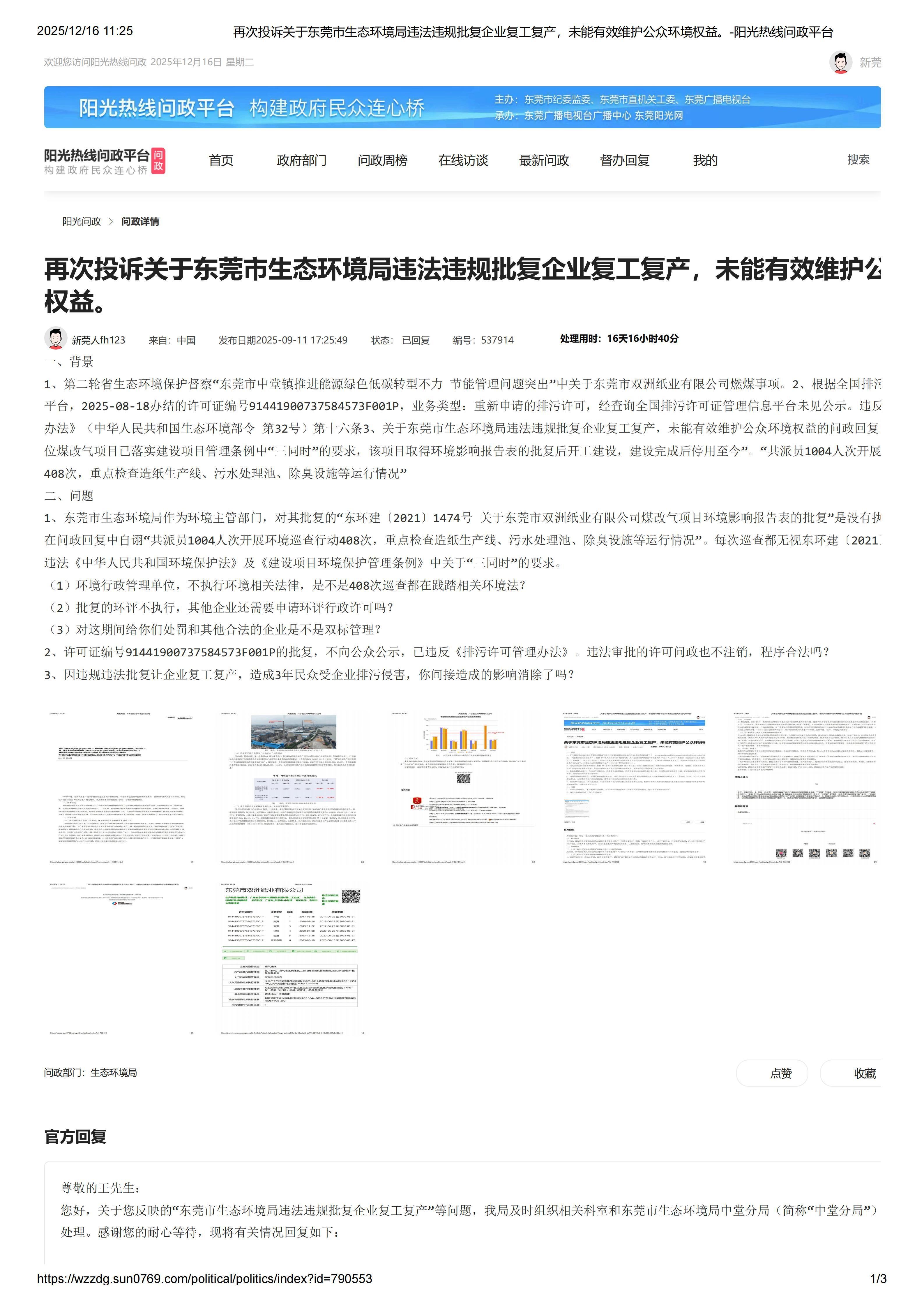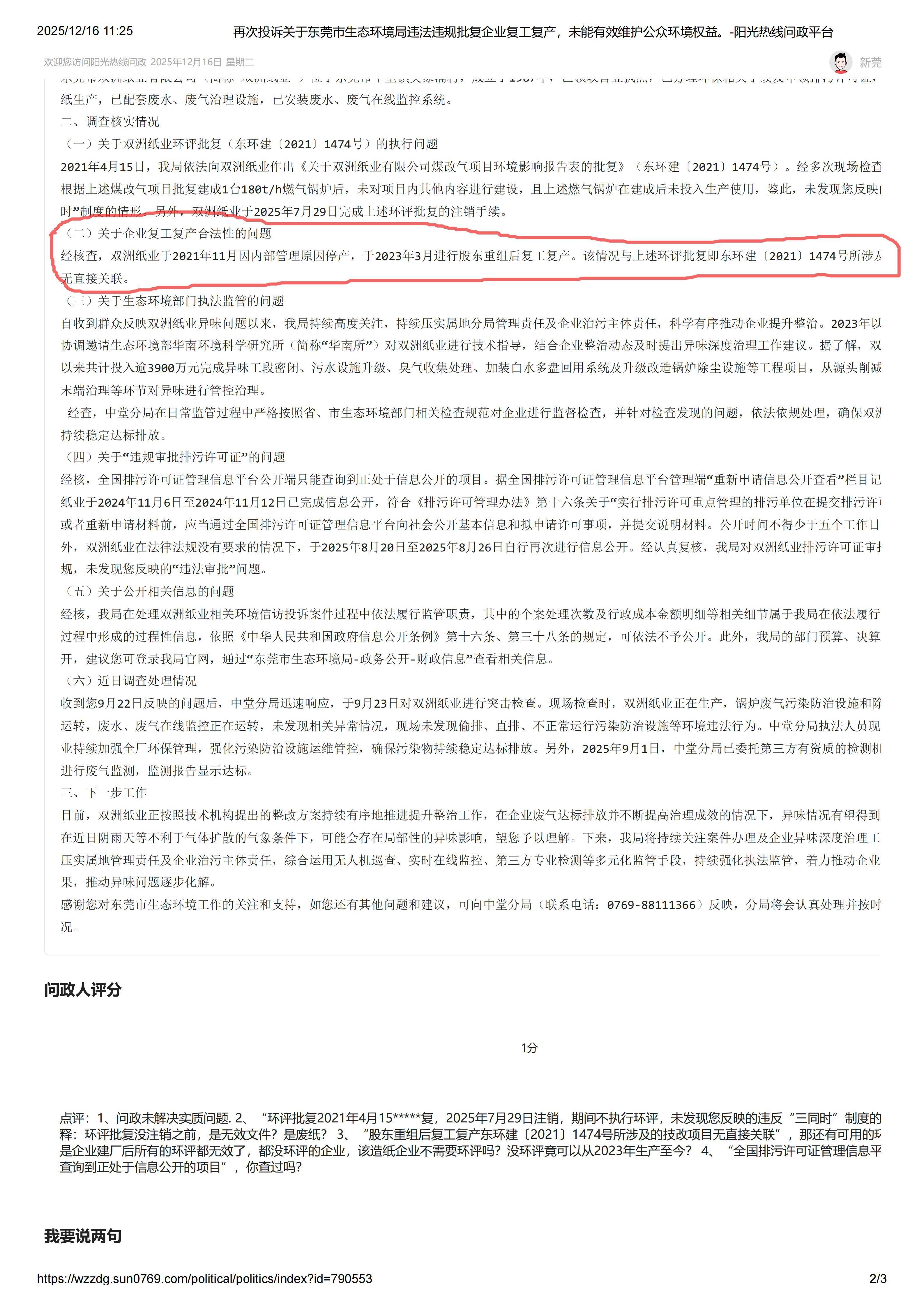 一、背景 根据阳光热线问政平台编号为537914的问政内容“再次投诉关于东莞市生态环境局违法违规批复企业复工复产,未能有效维护公众环境权益”。 东莞市生态环境局官方回复:关于企业复工复产合法性的问题 经核查,双洲纸业于2021年11月因内部管理原因停产,于2023年3月进行股东重组后复工复产。该情况与上述环评批复即东环建〔2021〕1474号所涉及的技改项目无直接关联。 二、问题 1、批复的环评竟然不与经营主体挂钩,只要股东重组就可以认定为无直接关联。东莞市生态环境局,你如此官方回复包庇企业,你们之间有什么利益关系? 2、如果企业不想执行环评,随便变更个股东,连公司主体都不用管,就可以不执行环评。那企业还有必要做环评吗? 3、作为主管生态环境的部门,让企业随意排放污染物,3年未解决。你们想干什么? 4.你们局的**廉政建设是不是只在会上有效?