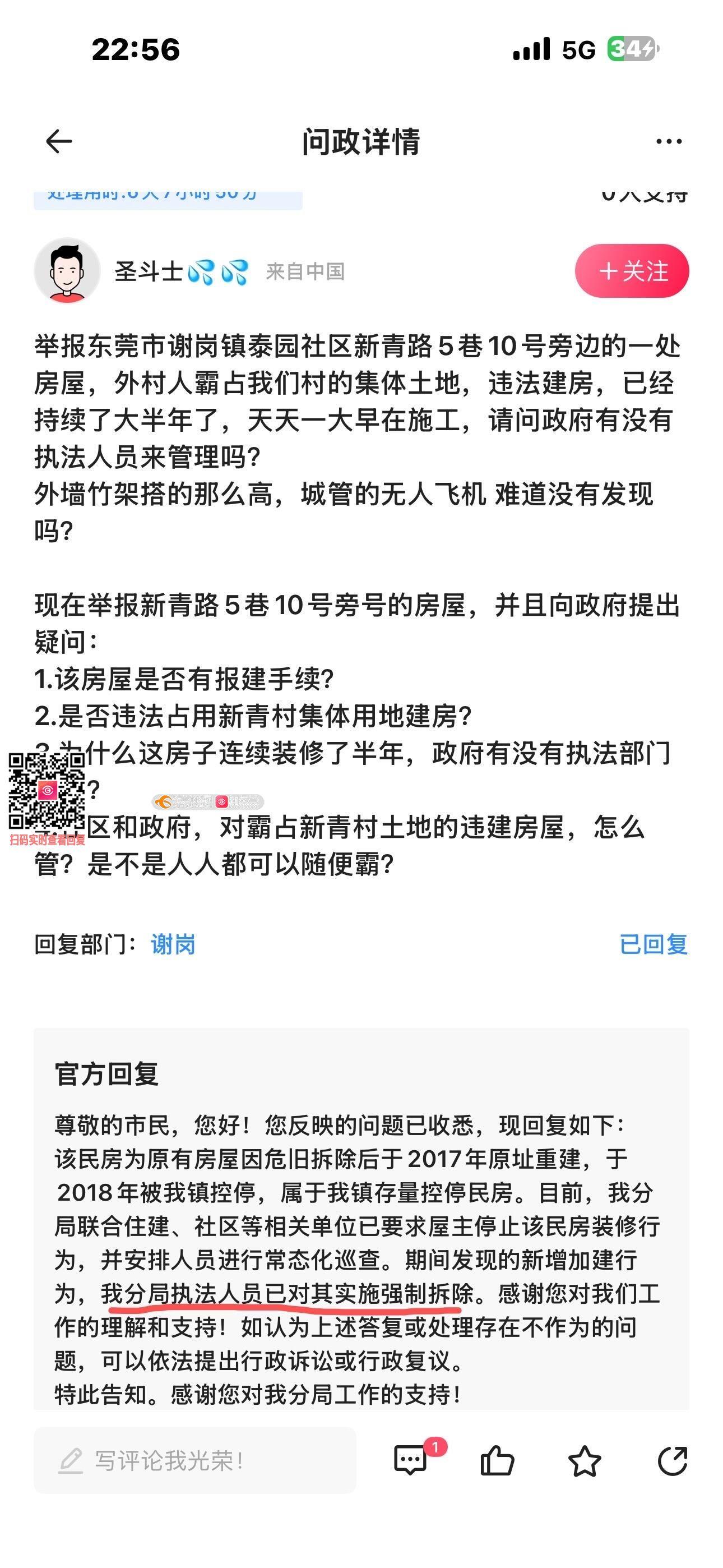 致:东莞市城市管理和综合执法局 事由: 我村其他村民此前通过问政平台反映,东莞市谢岗镇泰园社区新华路五巷10号旁(即8号房屋)存在违法建设行为。谢岗镇城管分局于回复中明确表示:“我分局执法人员已对其实施强制拆除”。 核心疑点: 经对比2025年4月和2025年8月23日的现场图片,与现实的情况,该房屋一楼架空层围蔽及顶楼楼梯间新建部分(涉及结构改变、面积增加)仍未拆除,与城管分局“已实施强制拆除”的回复严重不符。 事实依据: 1. 谢岗城管分局在问政回复中称已强制拆除新增违建; 2. 2025年11月27日现场执法图片显示,房屋一楼架空层围蔽及顶楼楼梯间新建部分仍存在,未拆除; 3. 《东莞市违法用地、违法建设联合执法实施方案(修订)》(东府办〔2020〕49号)明确要求对新增违建“即查即拆”,并建立多部门联合执法与监督机制。 质疑与诉求: 谢岗城管分局的回复与实际情况明显矛盾,涉嫌“虚假拆除”及纵容包庇新增违建行为。现依据上述联合执法方案,请求上级机关市城管履行对下级的监督职责,核查以下事项: 1. 对谢岗镇泰园社区新华路五巷8号房屋的一楼架空层围蔽、顶楼楼梯间新建部分是否实际拆除进行现场核实; 2. 查明谢岗城管分局是否存在虚假上报、执法不实或包庇违建的行为; 3. 如查实“虚假拆除”,请依据相关规定对责任单位及人员进行处理,并责令限期依法拆除新增违建。