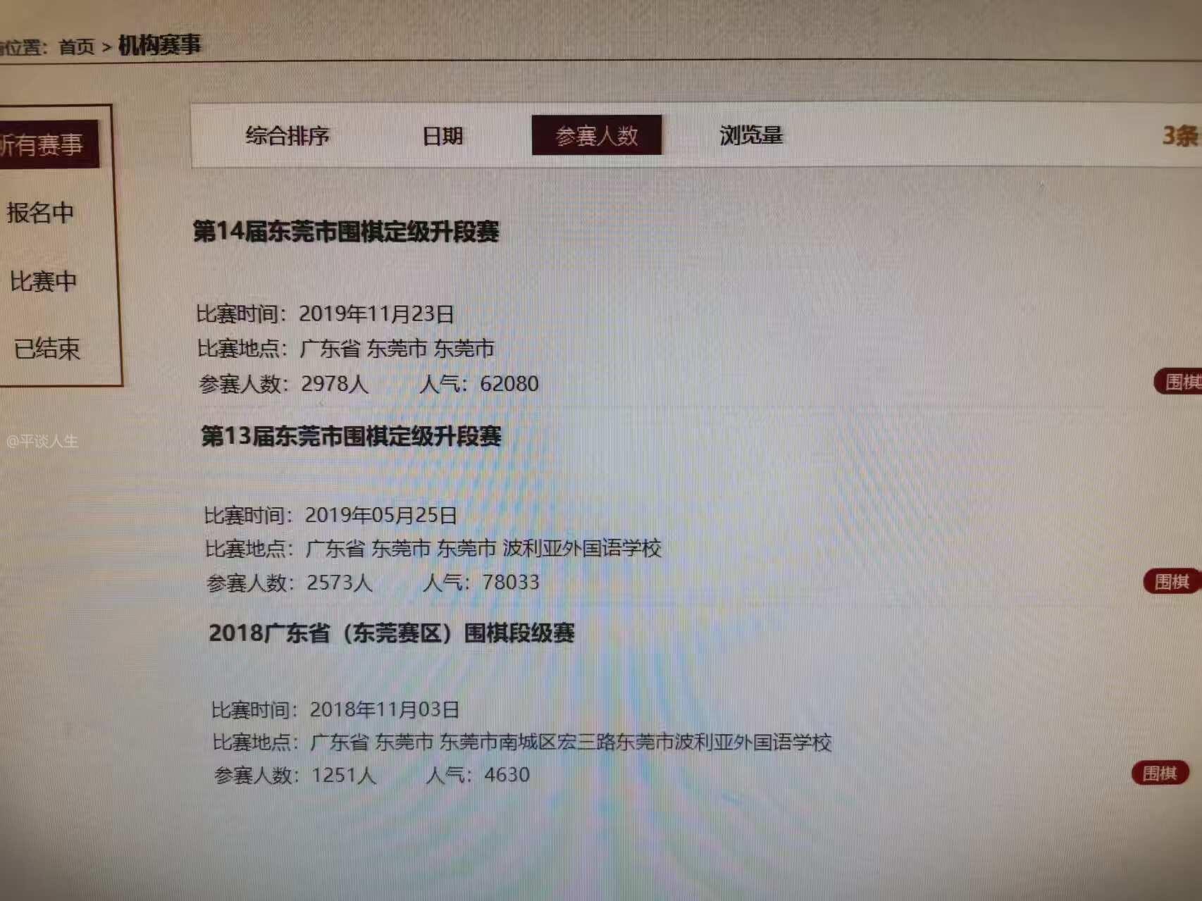 东莞市围棋协会从2005年至今已经举办了20届比赛,分每年春、秋2次赛事,平均每次赛事超过2000人,每次比赛都是收取报名费的(260元人项)其报名费直接由各棋社机构老板代收,协会也从未开具发票,一年盈利80多万元,从未交过一分钱税,协会也没有固定工作人员,到了年底协会股东进行利润分红。