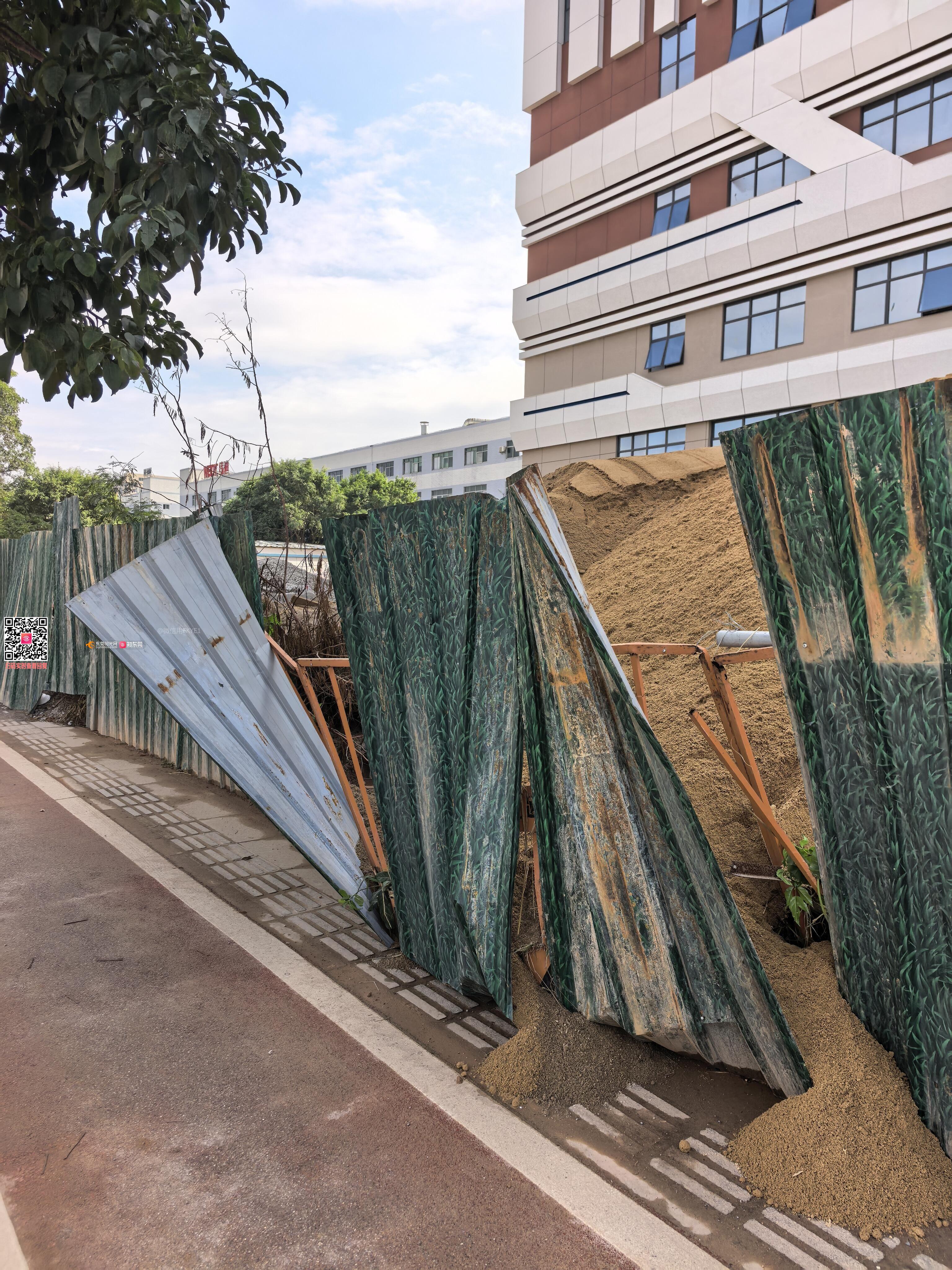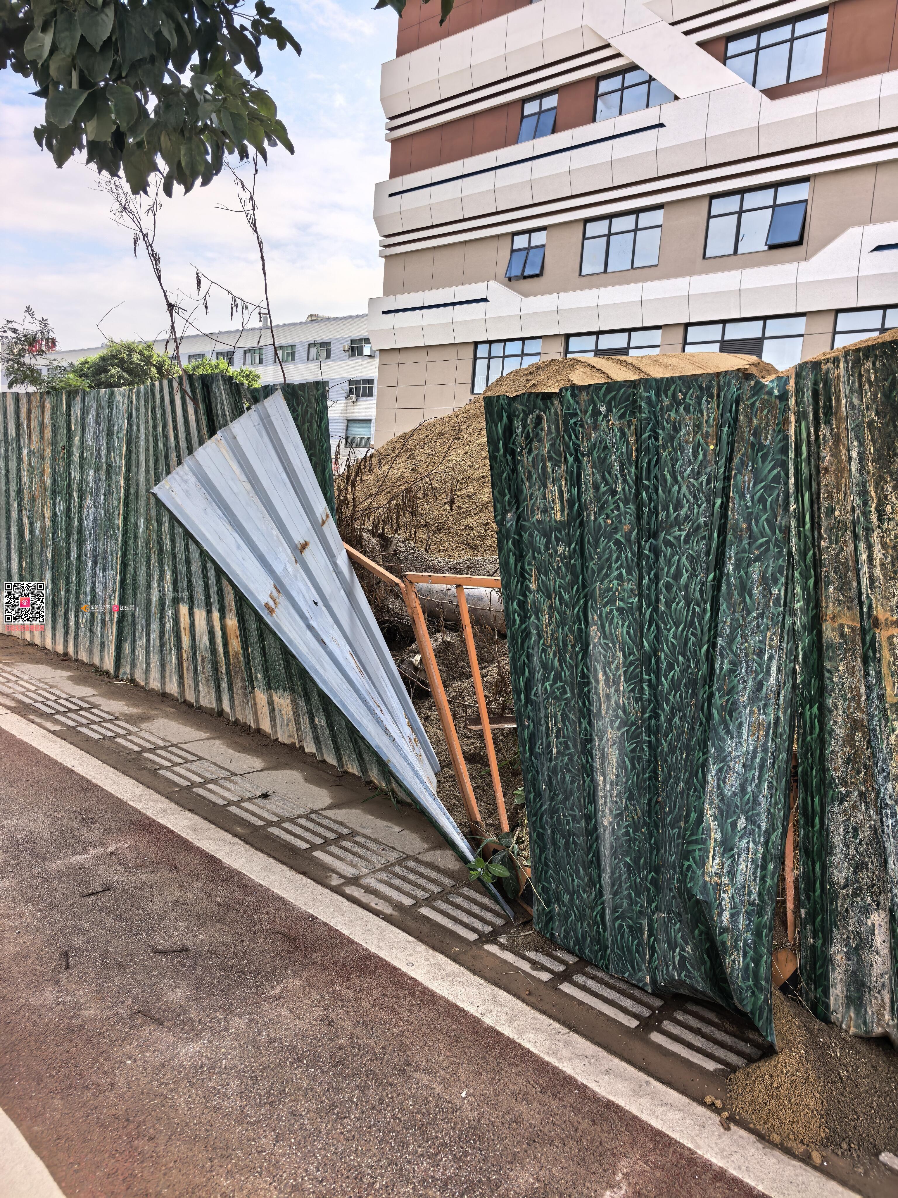 塘厦镇康贝路1号的天邦达,东雅集团往平山收费站方向那边那个,地址够清晰了吧。 内部这么大的工地,每次都在这个位置堆积大量的沙子,石子,三天两头导致这个铁皮撑开,今天这个情况更离谱,直接大片尖锐部分裸露到人行道和单车道,工地工人自己都说早上反馈给工地项目部了,直到下午5点还是这个情况!附近多少工业园工厂和公司,来来往往多少人,根本不在意别人的人身安全。为什么非得在这个位置集中堆积大量沙子石子?三天两头撑破铁皮,又不去及时处理?这个工地自施工以来,路被压烂了,现在用铁板木板铺,做个样子给人看?杂草丛生最近才改善,又屡屡出现铁皮裸露的问题,到底是防护还是杀器?最可笑的是整整一天了铁皮还挂在人行道上。从看到问题到反馈问题到解决问题,时间都不知道去到多久了!到底哪个部门及时能处理能从根本上杜绝这种问题?