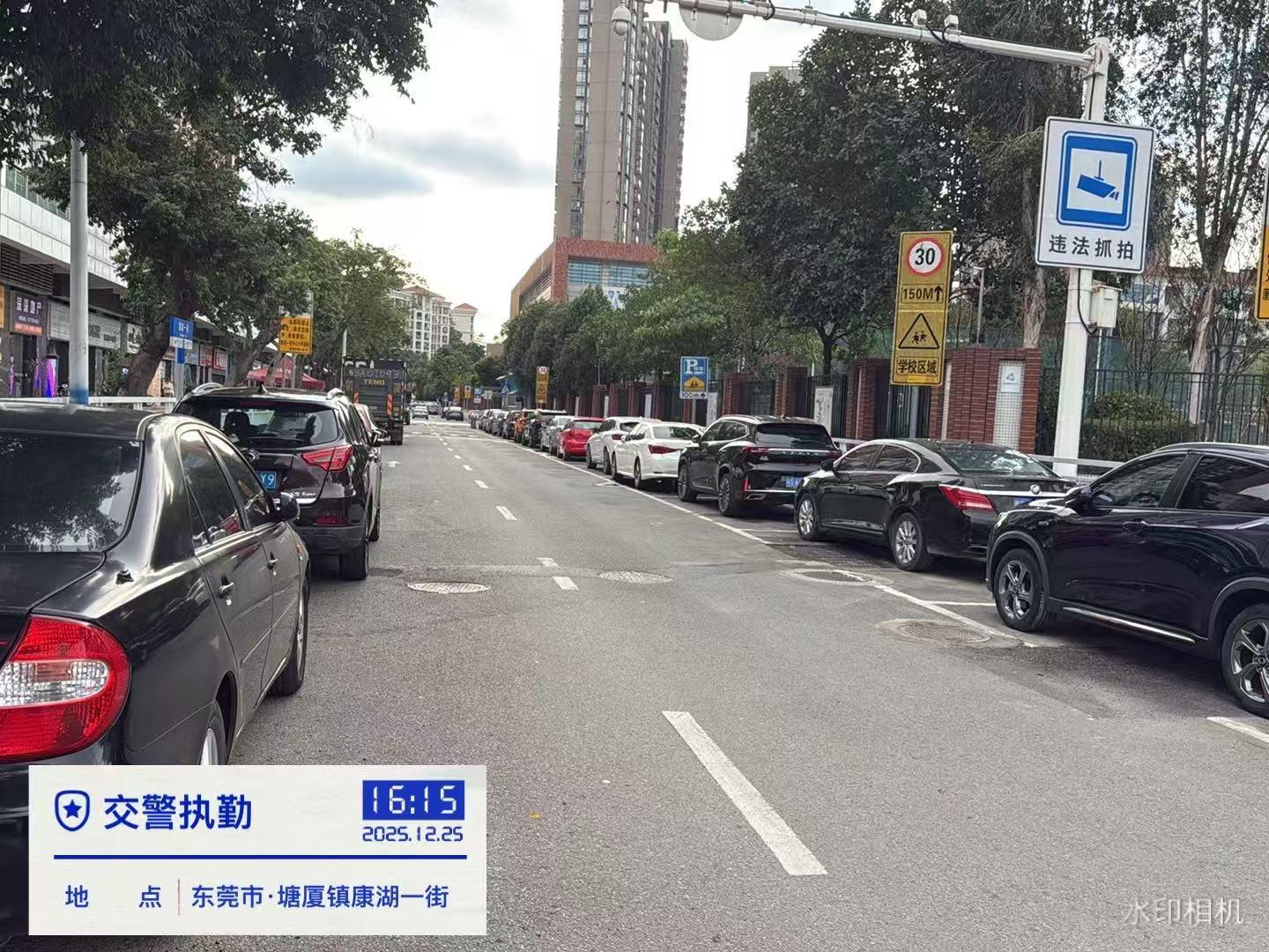 塘厦镇四村康湖一街,小学幼儿园路段,长期24小时都是违停车辆,占人行道,斑马线,黄格线,无人管理,严重影响学生出行安全