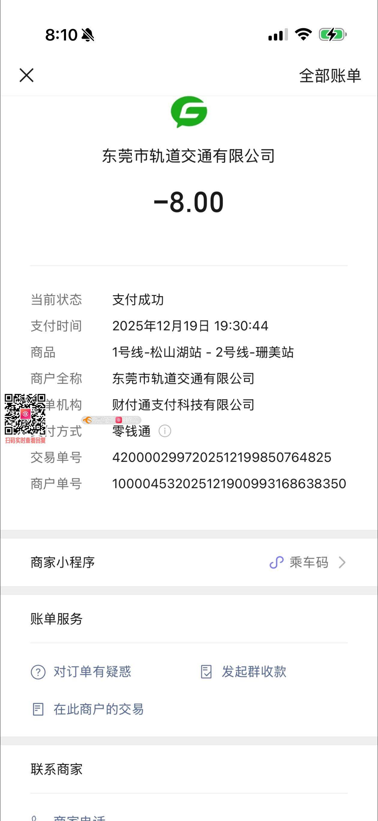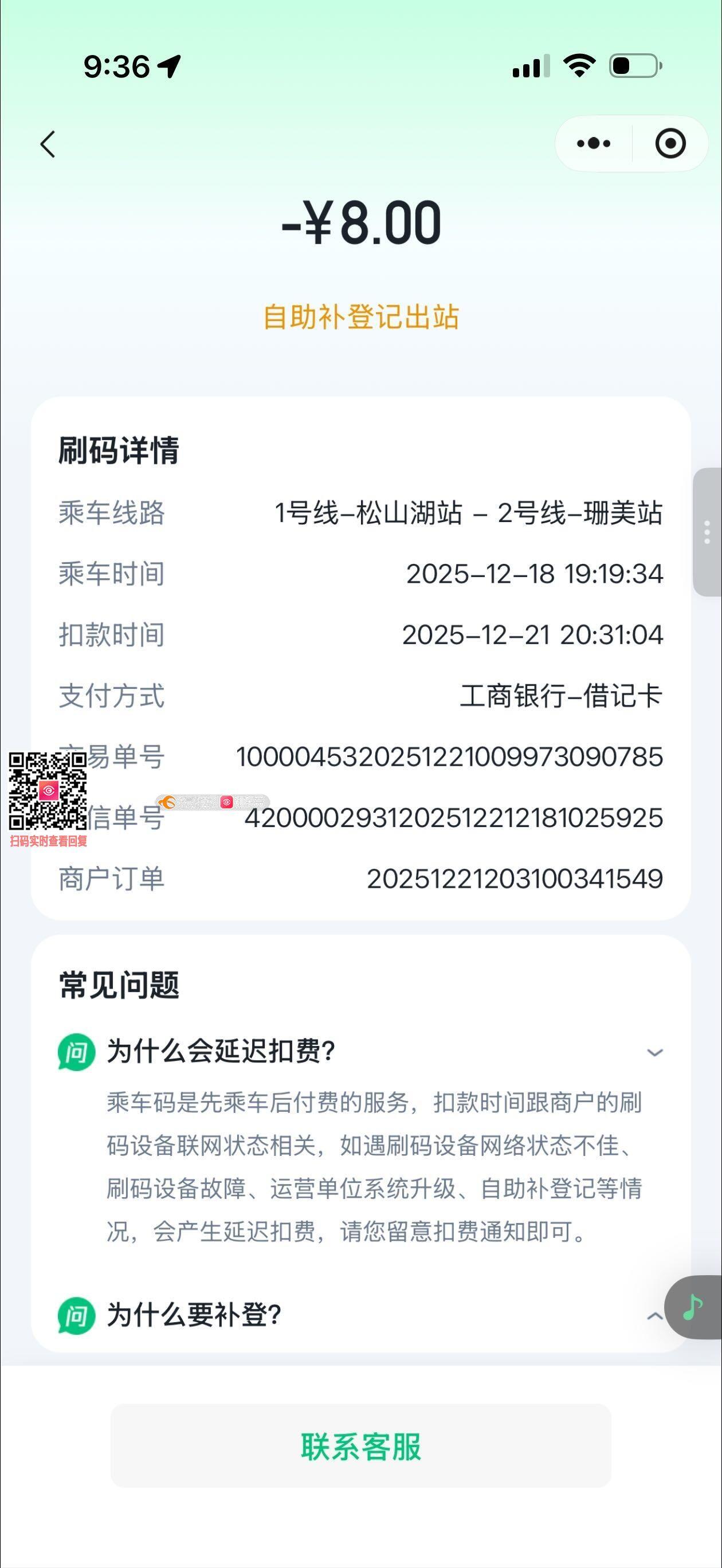 2025年12月19日星期五下午6点34分乘坐1号线从松山湖站经市民中心转2号线至珊美站下车,车费8元,当晚7点30分微信已支付车费8元(如下图1),后收到若干次补登站点通知,2025年12月21日晚8点30分,针对同一次乘坐,再次扣费8元(如下图2)。重复扣费部分请查明,退回。
