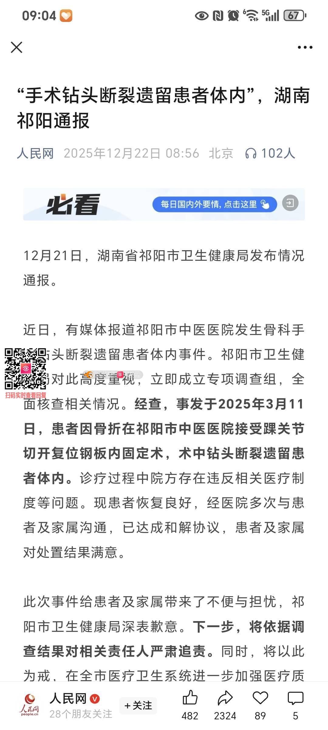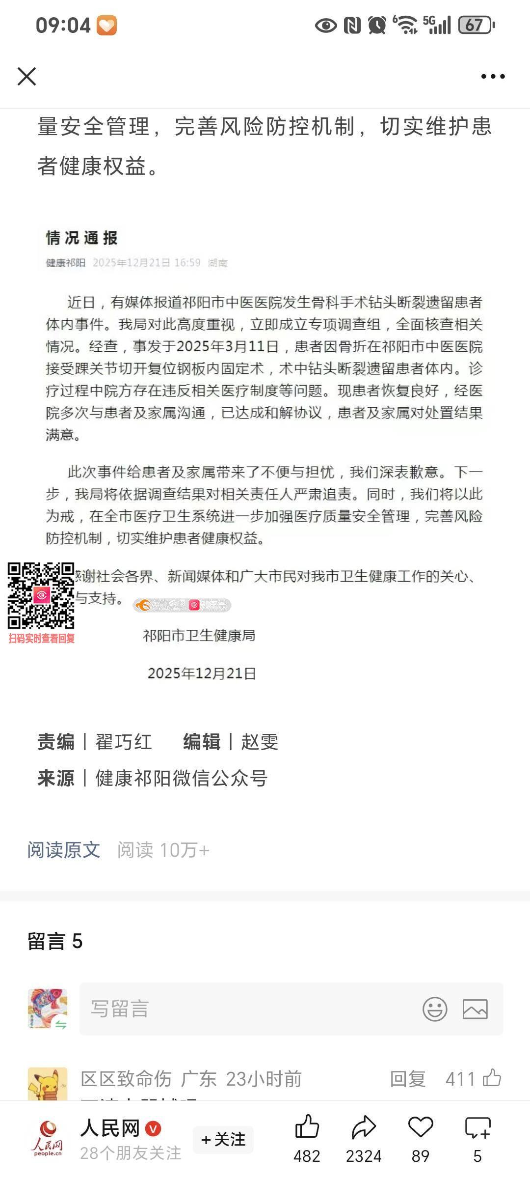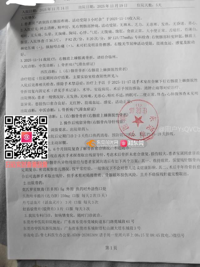 东莞市中医院在为15岁未成年患者手术中,因使用已疲劳老化的不合格手术器械,导致导针术中断裂并永久残留患者体内。事后,院方将自身管理失职所致的“器械疲劳”问题,轻描淡写为“不可控的意外”,并辩称该器械可重复使用,却在收费中按新品计费。此举涉嫌严重医疗质量安全责任事故、医疗器械管理失职及价格欺诈,现向贵单位提出正式投诉,要求彻查。 1. 医院使用“疲劳”器械,却辩解为“意外”: 术后,手术医生承认断针系“导针疲劳”所致,却又称此系“不可控的意外”。“疲劳”是金属材料在反复使用后性能退化的可预见、可检测的物理状态。 将“疲劳”称为“意外”,实则是推卸其对手术器械进行日常检查、强度测试、定期更换等基本管理职责。这证明医院在医疗器械的安全性管理上存在系统性、源头性的失职。 2. 涉嫌重复使用并欺诈收费: 医生辩解称此类导针“可消毒后重复使用”。然而,医院收费明细中却按一次性新品收费(证据已备查)。此行为涉嫌违反医疗器械使用与收费规定,可能构成价格欺诈。 3. 造成不可逆伤害后推卸终身责任: 面对由其管理失职造成的永久性体内异物,院方仅告知“无法取出”,将后续所有健康风险(如影响未来医学影像检查、升学就业)及决策压力完全转嫁给患者家庭