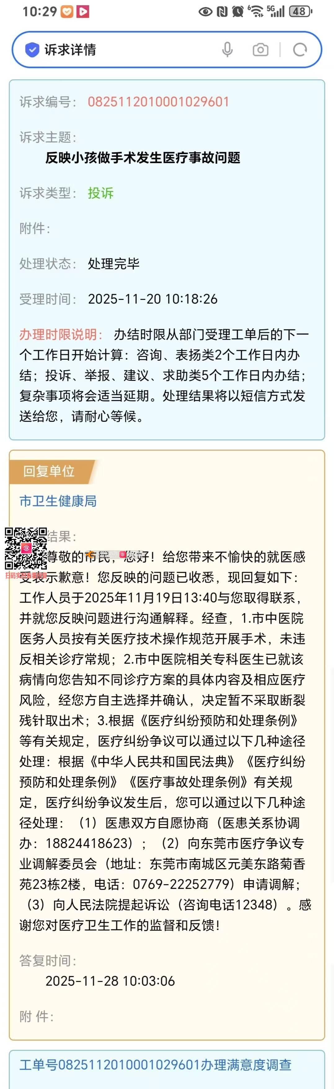 尊敬的市民,您好!您反映的问题,工单编号0825112010001029601,市卫生健康局已作出答复,回复意见:尊敬的市民,您好!给您带来不愉快的就医感受表示歉意!您反映的问题已收悉,现回复如下:工作人员于2025年11月19日13:40与您取得联系,并就您反映问题进行沟通解释。经查,1.市中医院医务人员按有关医疗技术操作规范开展手术,未违反相关诊疗常规;2.市中医院相关专科医生已就该病情向您告知不同诊疗方案的具体内容及相应医疗风险,经您方自主选择并确认,决定暂不采取断裂残针取出术;3.根据《医疗纠纷预防和处理条例》等有关规定,医疗纠纷争议可以通过以下几种途径处理:根据《中华人民共和国民法典》《医疗纠纷预防和处理条例》《医疗事故处理条例》有关规定,医疗纠纷争议发生后,您可以通过以下几种途径处理:(1)医患双方自愿协商(医患关系协调办:18824418623);(2)向东莞市医疗争议专业调解委员会(地址:东莞市南城区元美东路菊香苑23栋2楼,电话:0769-22252779)申请调解;(3)向人民法院提起诉讼(咨询电话12348)。感谢您对医疗卫生工作的监督和反馈!本次诉求您未提出新情况、新理由,根据《东莞市政务服务便民热线管理办法》第十条 不受理事项:(七)正在办理或者办理完毕,诉求人无新情况、新理由仍以同一事实、同一理由重复提出同一诉求事项(含承办单位认定终结办理的事项),告知诉求人办理进展或者办理结果。