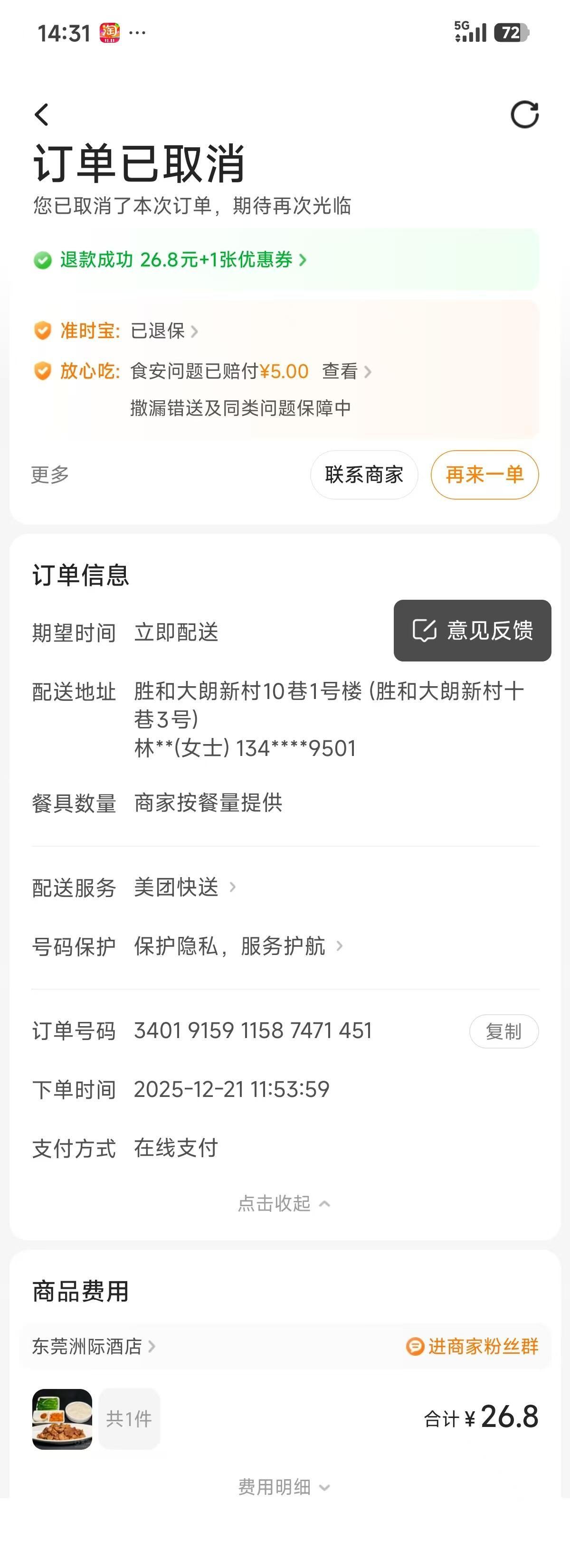 2025年12月21日11点53分用美团点了东莞洲际酒店(营业执照上名为:东莞市国贸酒店管理有限公司)的蚝油鲜菇滑牛肉套餐饭,结果半个小时送到后打开看了就感觉青菜有点黄的过头了,看着都黄到发黑样子了,咸蛋表面也有点干干的不像刚做出餐的样子,杂粮米饭也是好多一团团干干硬硬的小团不像饭焦的,牛肉和鲜菇倒是有点温热的,就试探性的吃了一下香菇感觉还行,等夹黄黑的青菜就有点棉棉过头了,不像是煮久了或者就配送那十来分钟焖黄的,凑近问一下好像有点点点点馊味,为了打消怀疑还是勉为其难的放进嘴里咬了,真的是馊了,馊味大菜还棉棉烂烂的,只能马上吐了,再另一些闻闻,青菜真的馊的,瞬间奔溃,感觉到非常失望,联系商家又各种推脱,说绝对新鲜,又提供不了证据说明它的餐品新鲜现做的,还说暗示吃了造成我身体不舒服才是他们食品有问题的,明眼一看餐品都有问题,是傻子才会继续吃吧,后续我没提出退款,商家直接给申请退餐退款,明显就做贼心虚,不想在平台有差评,洲际酒店做为一家星级酒店也出品变质的餐食,这个行业是不受相关部门监督和检查的吗?在东莞最繁华的地段的星级酒店出品的餐食竟然都是变质的,可想而知这个行业有过黑暗邋遢,有恃无恐的,我们这些大众消费者长期遭受这些无良商家蒙蔽和伤害。