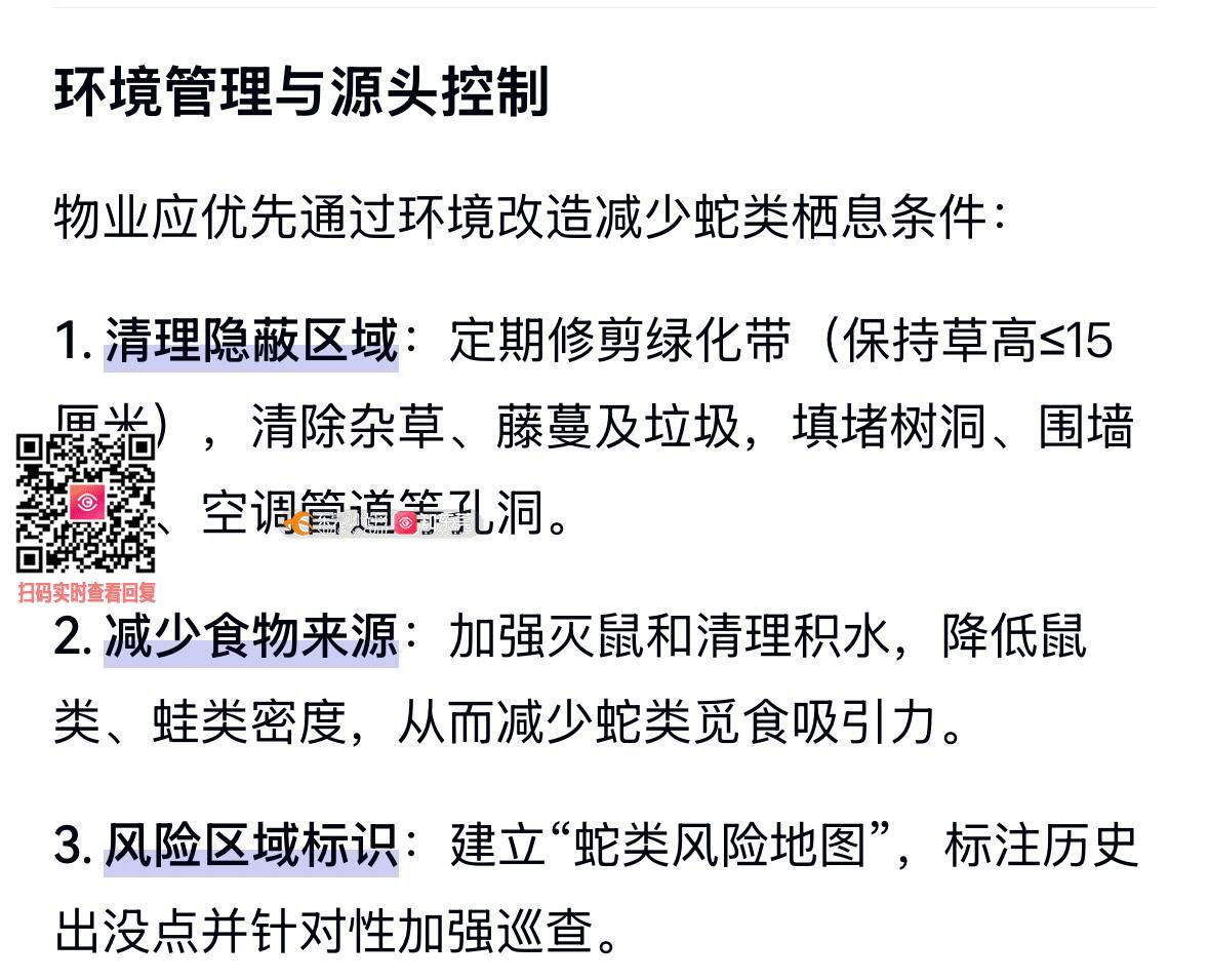 保利悦湖公馆2025年继11月24号发现蛇后,12月25日小区邻居又发现有蛇出没。小区内孩子多,严重影响居民安全。物业从去年抓蛇至今未抓到,严重不作为,违反了,请要求物业采取源头控制和物理化学措施,并每月定期向业主公布进展。