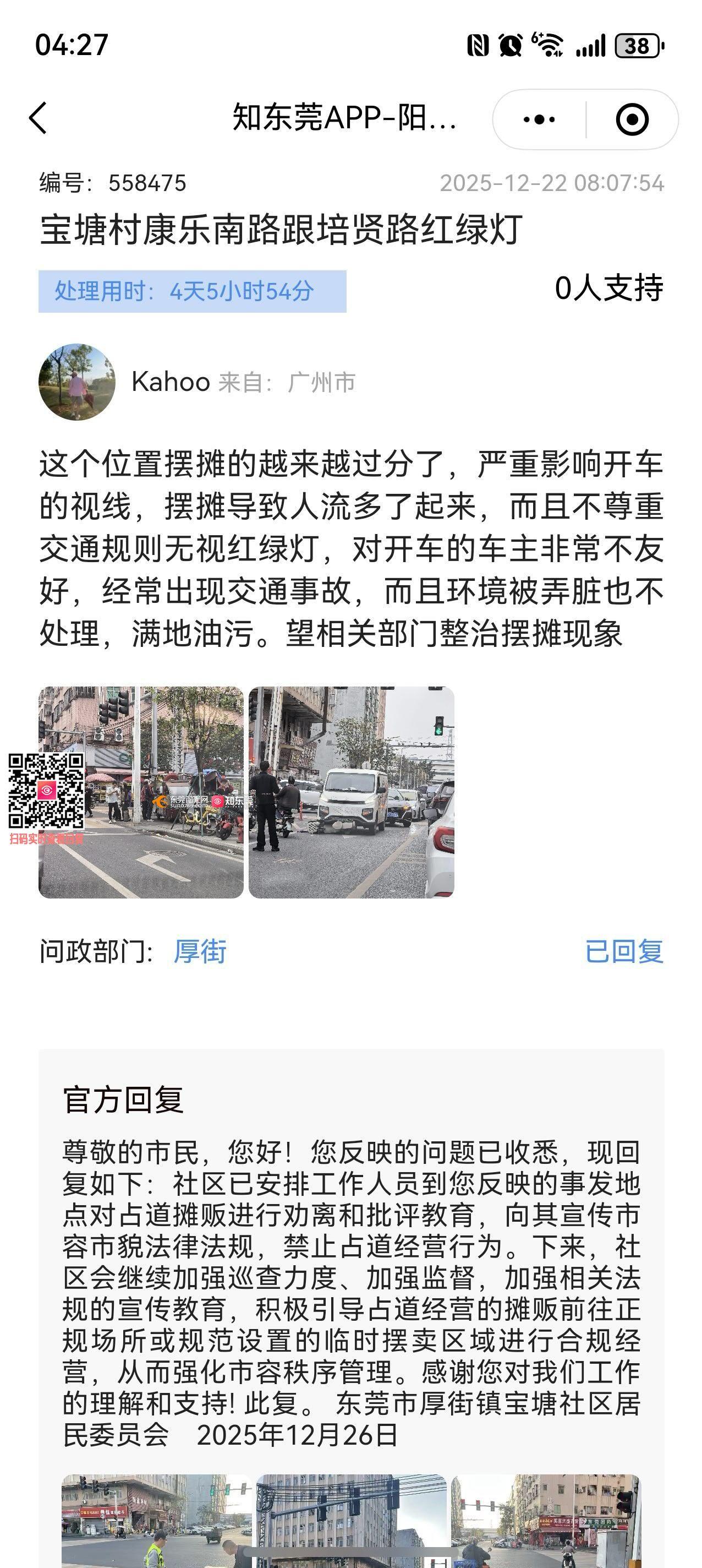 尊敬的市民,您好!您反映的问题已收悉,现回复如下:我社区已安排工作人员到你反映的事发地点对占道摊贩进行普法教育和劝离,向其宣传市容市貌法律法规,禁止占道经营行为。下来,社区会继续加强巡查力度、加强监督,加强相关法规的宣传教育,积极引导占道经营的摊贩前往正规场所或规范设置的临时摆卖区域进行合规经营,从而强化市容秩序管理。感谢您对我们工作的理解和支持! 东莞市厚街镇宝塘社区居民委员会 2025年12月31日