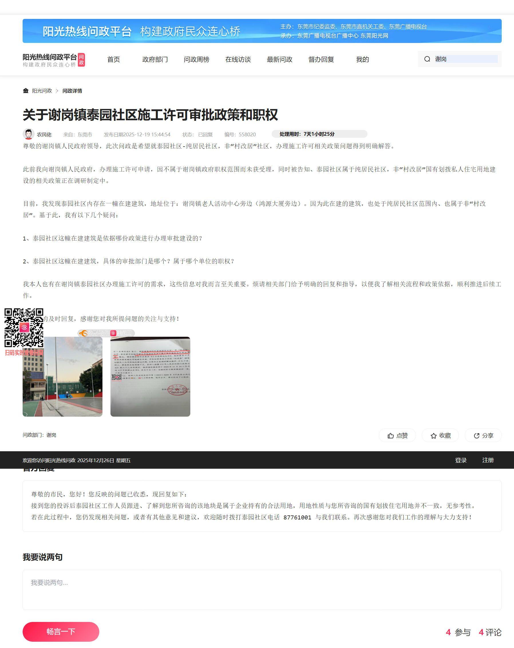 尊敬的谢岗镇人民政府领导: 您好!本人近期关注到谢岗镇泰园社区内一幢在建建筑(位于老人活动中心旁、鸿源大厦旁)。根据此前在“阳光热线问政平台”的公开回复(编号558028),泰园社区被明确为“纯居居民社区”,且针对“国有划拨私人住宅用地建设的相关政策正在调研制定中”。然而,该在建建筑的出现引发以下疑问,为监督政府依法行政、确保政策公开透明,特此问政: 1. 审批依据问题:该建筑目前动工建设,具体依据的是哪一项政策或规范性文件?是否已通过合法程序完成施工许可审批? 2. 职权归属问题:该建筑的审批单位是哪个部门?是否属于谢岗镇政府职权范围?如否,请说明具体审批主体及法律依据。 3. 政策衔接问题:若该建筑用地性质与企业用地相关(如此前回复中提及),请公开其用地性质、规划许可及施工许可的具体文件编号,并说明在“纯居居民社区”政策未明确期间,此类建设审批如何与现行政策衔接。 4. 公众监督需求:为保障公众知情权,请公示该建筑的完整审批流程、许可文件及合规性说明,以便社区居民对照参考。 本人作为关心社区建设的市民,希望了解相关政策执行是否公开、公平、公正。请相关部门依法依规核实情况,明确答复以上问题,并逐项回复,以回应公众关切。依法依规行政理念,共同营造公开、透明的政务环境。 感谢你们的辛勤工作!期待你们的及时回复。