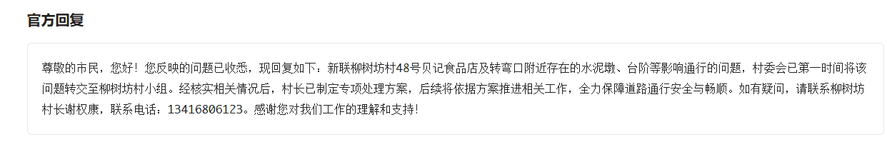 高埗镇新联柳树坊村民再次占用村主干道路,多处设置水泥墩、台阶等,严重影响消防、救护交通等通行,多次造成交通事故,应拆除! 只见官方回复“会”处理,1个多月过去了,实为“无”处理。 请回复拆除期限。