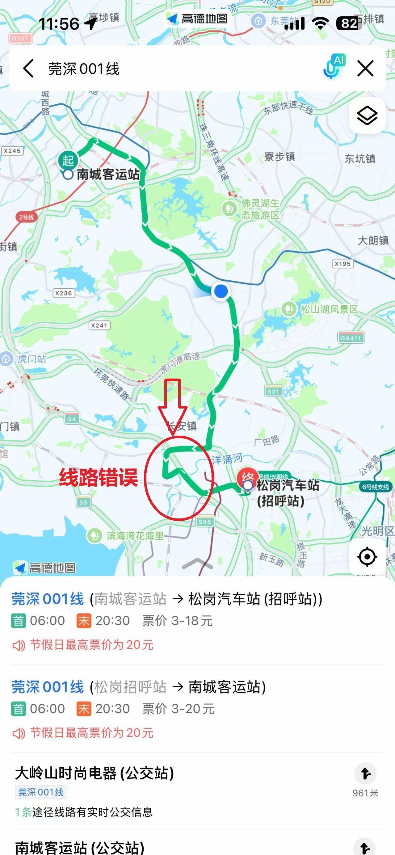 莞深001东莞往深圳松岗方向,在高德地图上的线路错误。 烦请莞深001的负责公司联系高德地图方提供正确的线路。 路线错误的影响: 1. 从东莞出发到深圳,高德地图无法正确生成最优的路线,从最短时间的角度来看,会自动忽略掉莞深001的路线,从而莞深001的路线得不到高德地图的推荐。 2. 未乘坐过莞深001的新客,会以为莞深001要进长安镇绕行,时间很长,从而放弃选择莞深001,导致莞深001的新客户流失。 错误的东西就要改掉。莞深001的深圳始发站现在貌似是松岗地铁站?公交车上的贴纸是不是叶要更新一下? 另外,能不能在大岭山镇矮岭冚站新增停靠站点?
