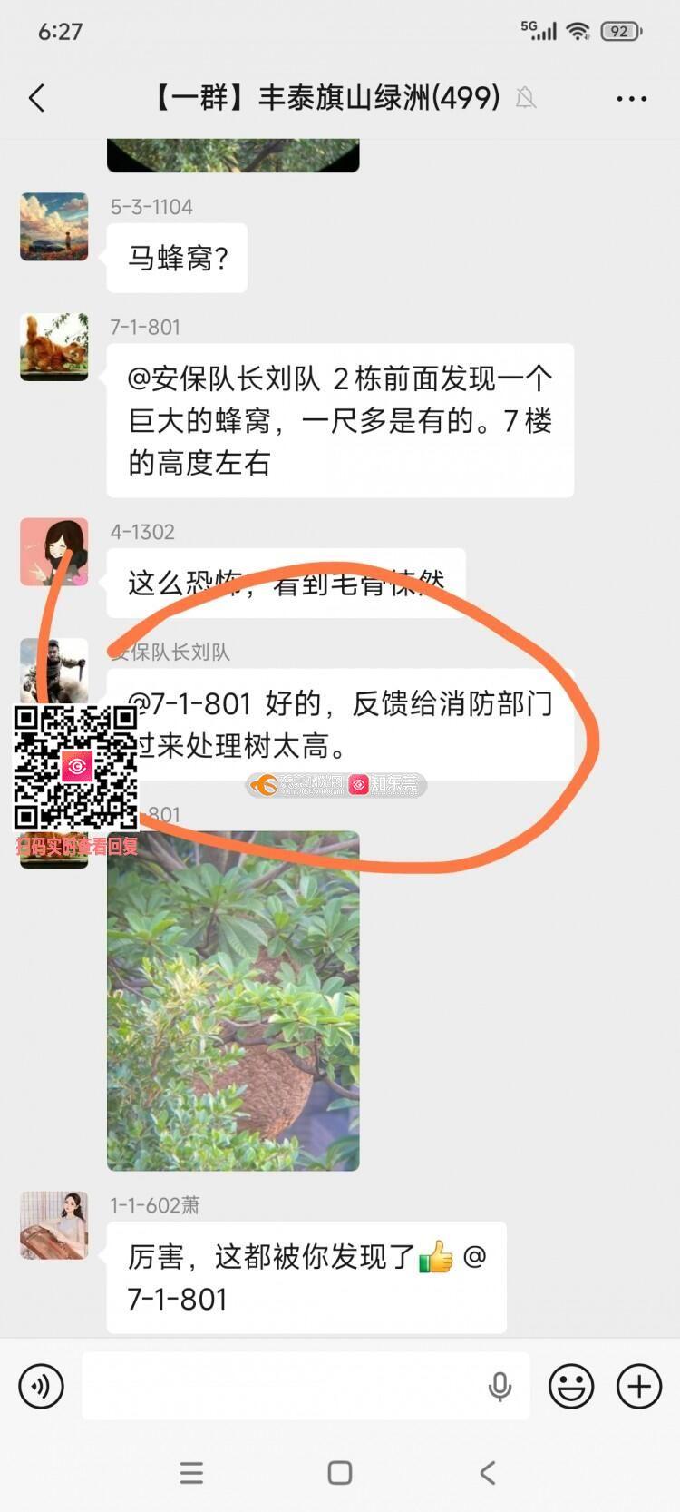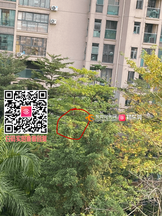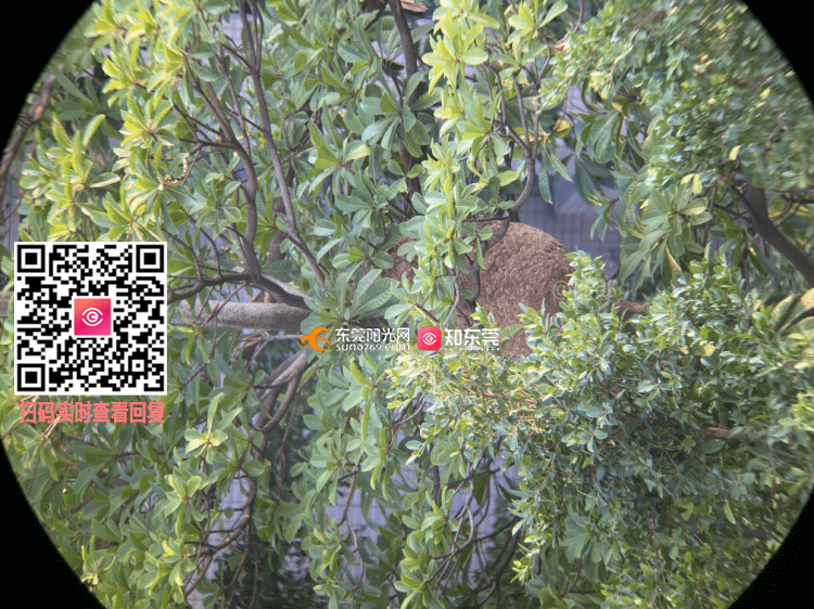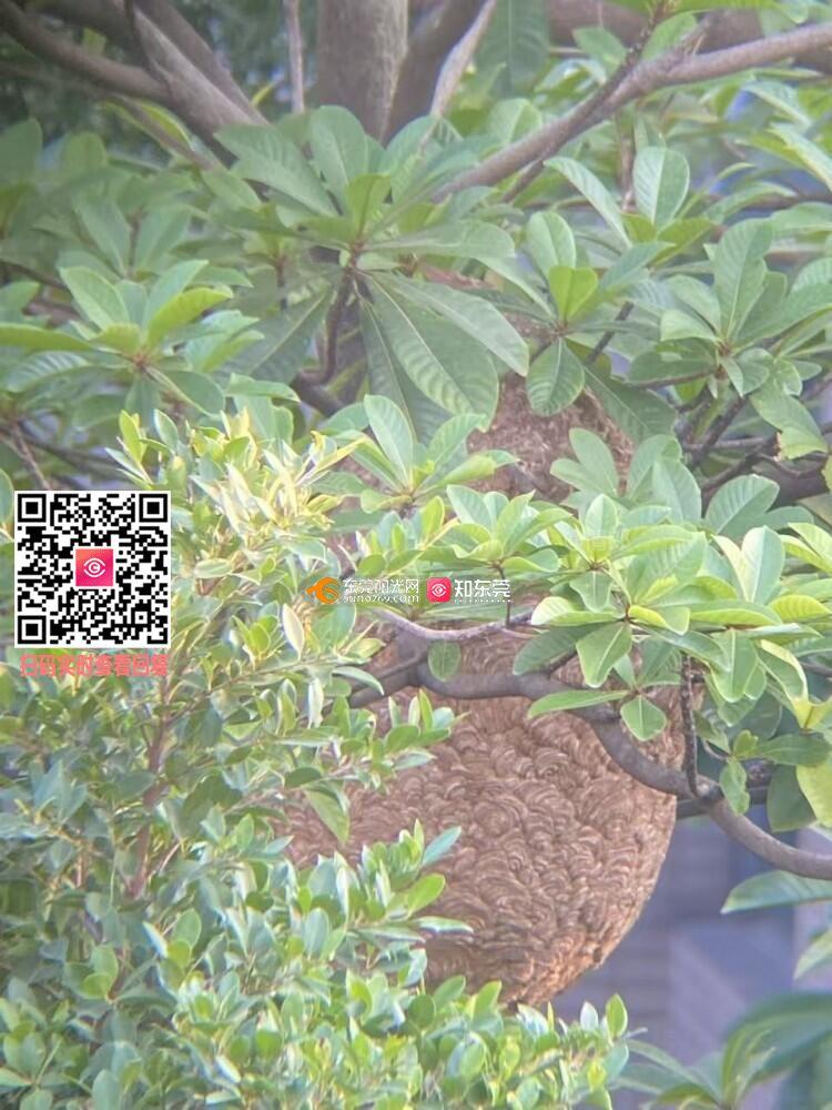 寮步镇丰泰旗山绿洲里马蜂窝严重居民生活,经常飞进家蛰人!差不多一年多才找到,一个多月前,发现了,消防来了说树太高了,处理不了!,目前存在很大安全隐患!!麻烦消防部根据处理!
