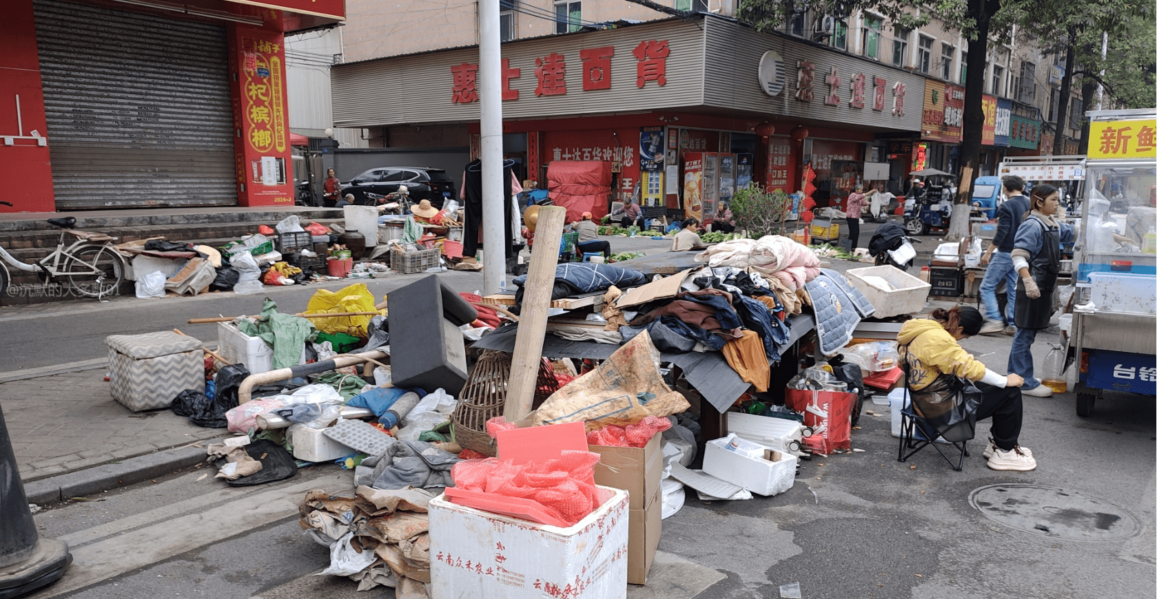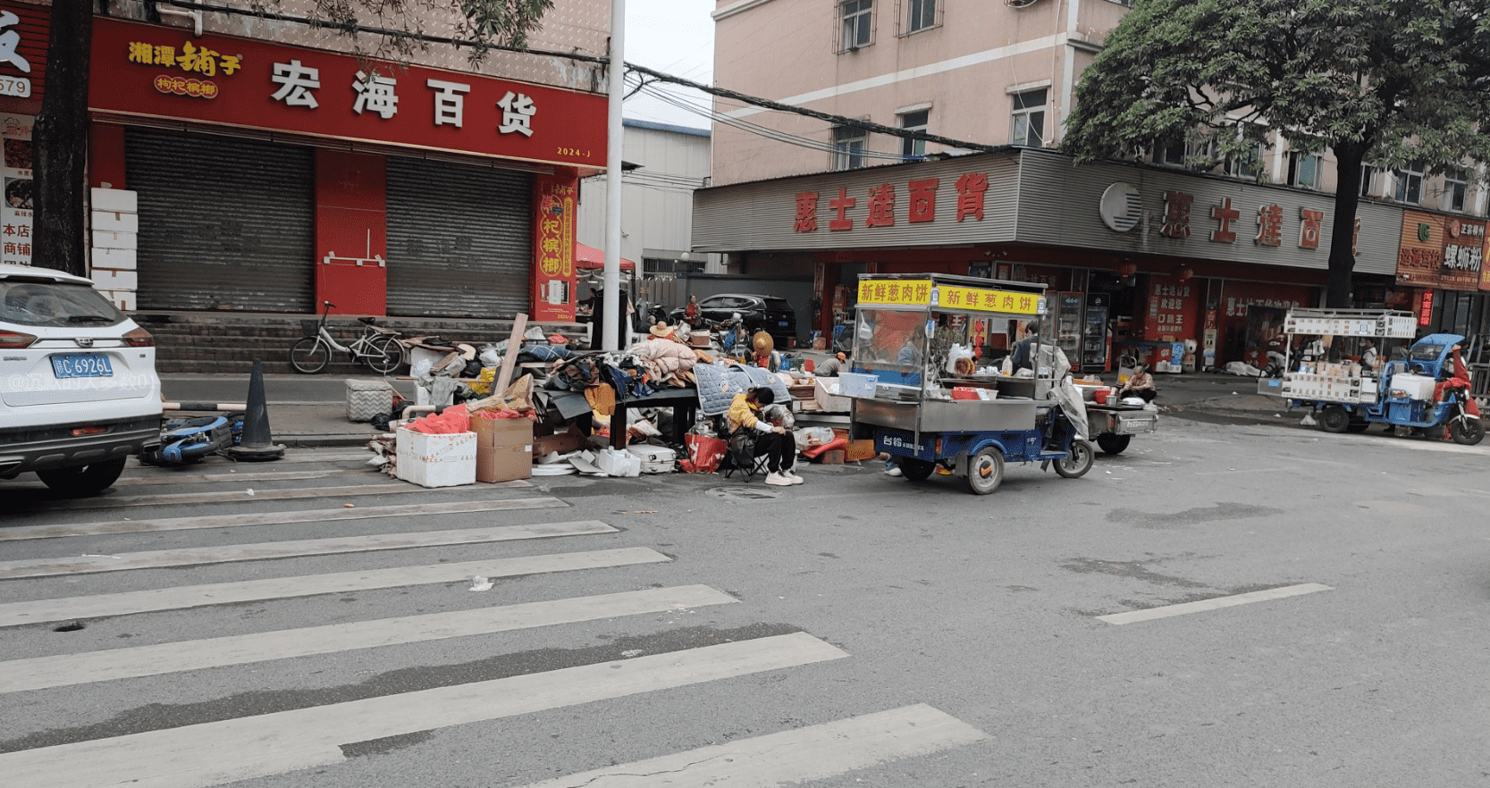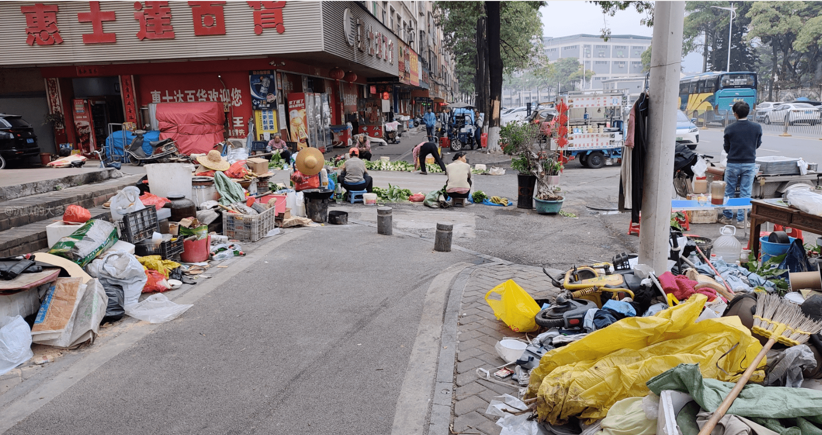水朗村垃圾、摆卖占道,臭味熏天,无法通行。