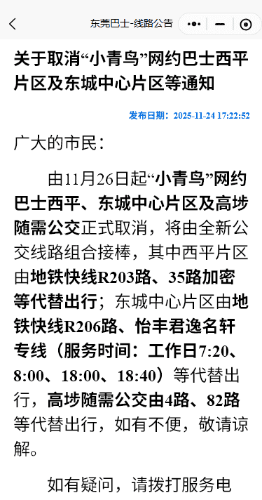 但到了2025年11月25日,东莞市城巴运输有限公司突然宣布撤销了两条小青鸟线路,并美其名曰进行了线路优化,现在都变成了地铁快线,地铁快线对于我们家长和学生来讲,这个线路都没有一个站点是靠近学校,对我们的工作生活和上学造成了极大的影响。