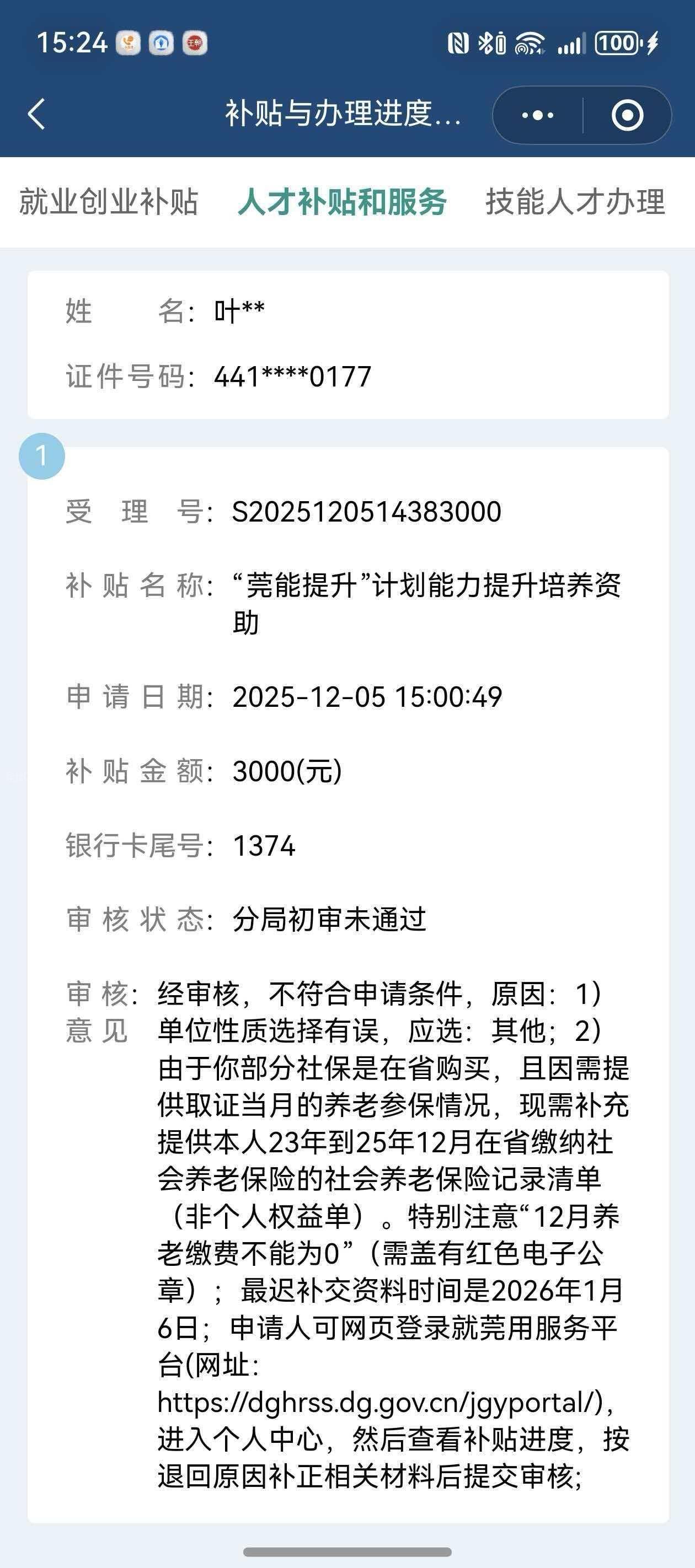 申请能力提升培养资助不通过,12月初申请的,12月31日短信通知不通过,提供了解决指引,内容提级需要23年到25年12月缴纳清单(需要红色电子公章)。通过查询,下载了【掌上12333APP】,好不容易登陆了发现需要登陆社保卡,注册进去发现能查询3年的缴纳记录,但红色公章的只有最近3个月的。想致电当地热线0769-22836661一直打不进去,好不容易打进去了,接了就秒挂,这是公职人员的办事方式?是否有人能解决这件事,如果因此导致补贴申请不了,是否有人担责?