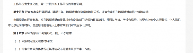 申请续聘的评审专家,应在聘期期满前按要求参加财政部门组织的教育培训,并通过考核。考核合格后,按要求上传个人承诺书、个人无犯罪记录证明等材料,由注册地的地级以上市财政部门审核后予以续聘。