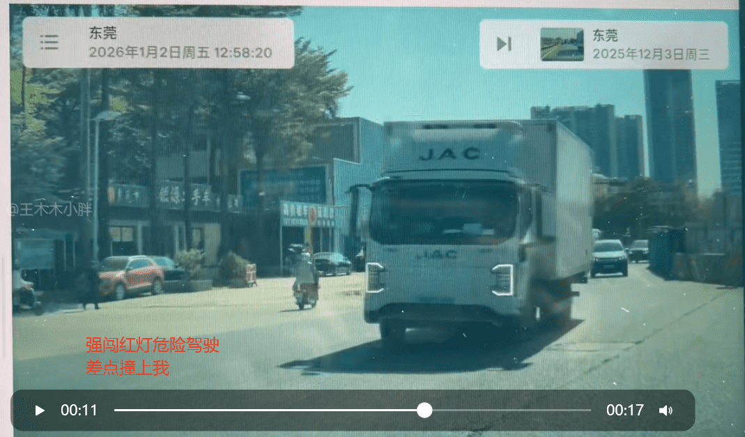 2026年1月2日,下午12点58分10秒左右,在黄江公常路(裕元工业园门口)红绿灯处,一部新能源小货车强闯红灯危险驾驶,差点撞上我,让我精神受到惊吓,并且还手指着我进行辱骂威胁。 车子型号是:JAC 新能源小货车 车子颜色:白色 车牌号:行车记录仪拍摄不清晰,疑是 粤SDM5056(可以查询该路段的监控,我这边也可以提供相关的行车记录仪视频) 发生时间:2026年1月2日,12点58分10秒左右