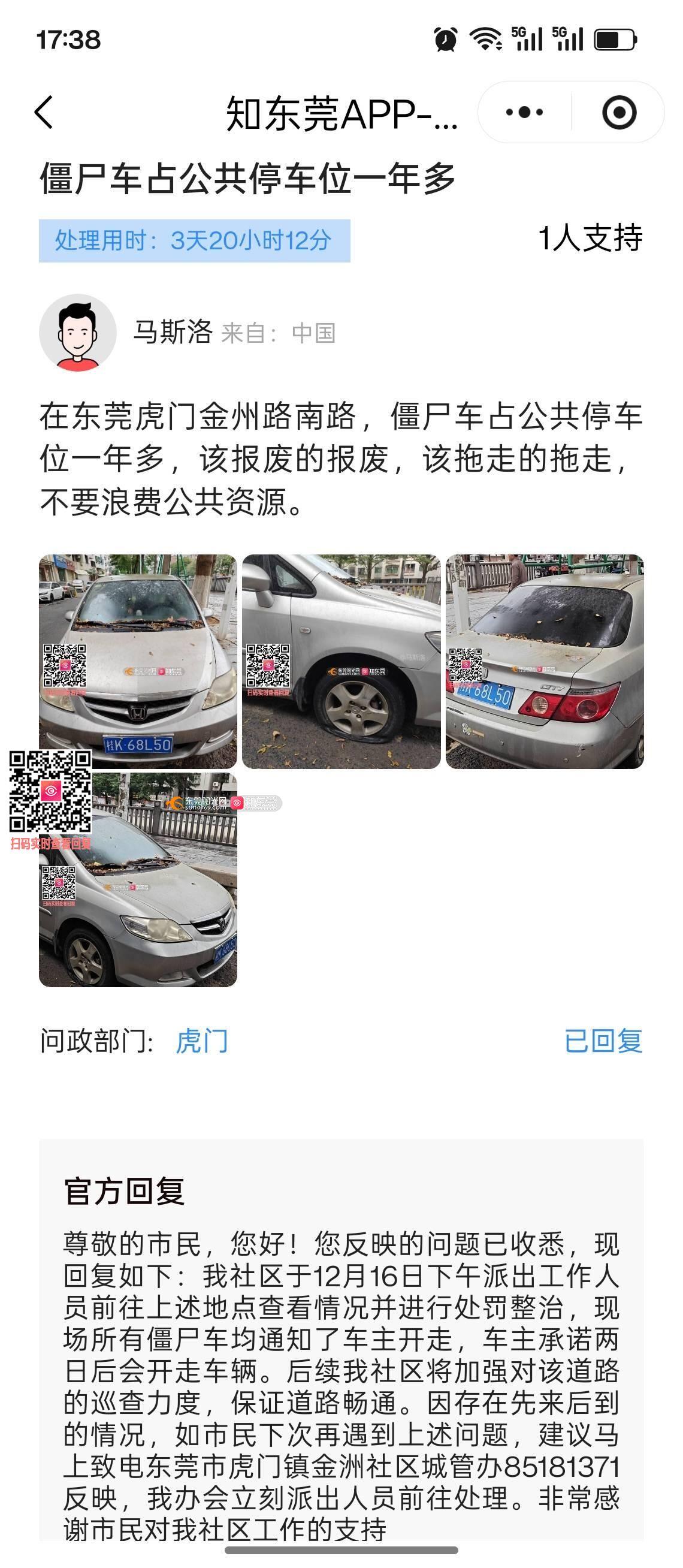 在东莞虎门金州路南五巷33号门前,僵尸车占公共停车位一年多,该报废的报废,该拖走的拖走,不要浪费公共资源,距离上次投诉已过去两周,车还在原位。