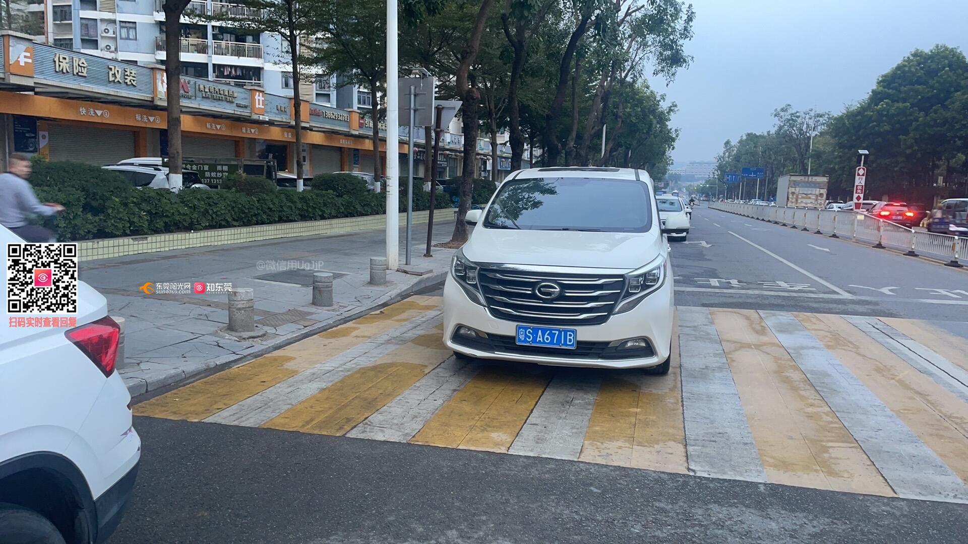 粤S A67IB在广东省东莞市台心路雅园新村A区东的人行横道上随意停放,挡住人行及车辆来往,在随手拍小程序举报成功并已通知车主前往交警大队处理,但实际并未得到解决,车主还天天停在人行横道,每天早上7点钟都可以看到,希望可以通知车主别停在人行道得到实际解决