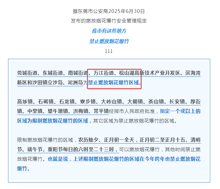 2026 年 1 月 4 日凌晨 1:43 左右,在东莞市万江街道龙湾湿地公园附近的东江河道区域,有人违规燃放大型烟花,巨大的爆炸声严重影响周边居民夜间休息。此外,该区域平时还存在未成年人不顾过往行人安全、随意燃放鞭炮的情况,已对公共安全造成隐患。万江街道属于东莞全年禁放烟花爆竹区域,恳请相关部门及时核查处置,加强该区域的日常巡查监管,杜绝此类违规行为再次发生。